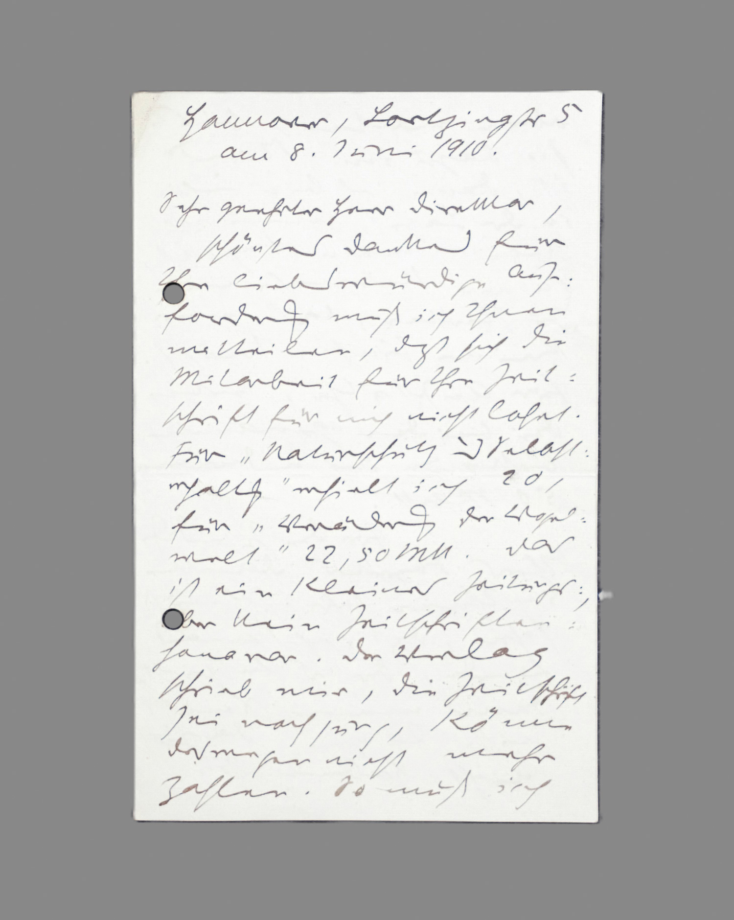 An den Herausgeber einer Zeitschrift, der Löns zur Einsendung von Beiträgen eingeladen hatte. Der Dichter lehnt ab mit der Begründung, "daß sich die Mitarbeit für Ihre Zeitschrift für mich nicht lohnt. Für 'Naturschutz und Selbsterhaltung' erhielt ich 20, für 'Veränderung der Vogelwelt' 22,50 Mk. Das ist ein kleines Zeitungs- aber kein Zeitschriftenhonorar. Der Verlag schrieb mir, die Zeitschrift sei noch jung, könne deswegen nicht mehr zahlen. So muß ich eben warten, bis sie dazu im Stande ist, denn ich bin nicht in der Lage, meine Arbeit, mein Kapital, in ein Unternehmen zu stecken, das mir keine Zinsen trägt. Für Aufsätze, wie die beiden genannten, bekomme ich anderswo 50 Mark. - Für die Zusendung Ihres Werkes danke ich Ihnen sehr. Ich muß sehen, daß ich jemand finde, der es bespricht, denn meine Kentnisse langen dazu nicht. Haben Sie nicht eine Kritik liegen, die ich nachdrucken kann? ...". - Gelocht.