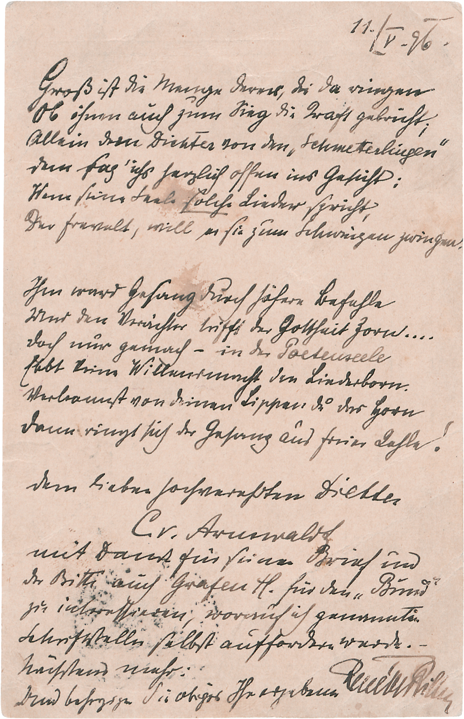 Frühes Gedicht des Zwanzigjährigen (das erst in neuerer Zeit entdeckt wurde), auf einer Postkarte an den zuvor mit einem Gedichtband hervorgetretenen Jurastudenten Carl von Arnswaldt (1869-1897) in Göttingen: "Groß ist die Menge derer, die da ringen / Ob ihnen auch zum Sieg die Kraft gebricht; / Allein dem Dichter von den 'Schmetterlingen' / Dem sag' ich's herzlich offen ins Gesicht: / Wem seine Seele solche Lieder spricht, / Der frevelt, will er sie zum Schweigen zwingen. - Ihm ward Gesang durch höhere Befehle / Und den Verächter trifft der Gottheit Zorn ..." (insgesamt 12 Zeilen). - Darunter die Widmung: "Dem lieben hochverehrten Dichter C. v. Arnswaldt mit Dank für seinen Brief und der Bitte auch Grafen H. für den 'Bund' zu interessieren, worauf ich genannten Schriftsteller selbst auffordern werde ...". - Gemeint ist der wohl mehr erstrebte als ernsthaft projektierte "Bund der wahrhaft Modernen", als dessen Mitglied Rilke sich auch Arnswaldt wünschte. Anfang des Jahres hatte Carl von Arnswaldt gemeinsam mit seinem ehemaligen Leipziger Kommilitonen, dem später als Völkerrechtler berühmt gewordenen Albrecht Mendelssohn Bartholdy (1874-1936), den Gedichtband "Schmetterlinge" herausgebracht, auf den Rilke im April mit einer lobenden Besprechung in der Zeitschrift "Jung-Deutschland und Jung Elsaß" hingewiesen hatte. In dem von Rilke erwähnten Brief muß Arnswaldt Zweifel am eigenen dichterischen Vemögen geäußert haben; wenn Rilke in seinem Gedicht nicht nur diese Zweifel ausräumt, sondern den Autor ermuntert, ja es ihm zur Pflicht macht, seiner Berufung zu folgen, gibt er auch zu erkennen, daß Rilke, der an Jahren Jüngere, sich dieser Berufung bereits gewiß ist. - Etwas fleckig und leicht geknittert. - So früh sehr selten. - Beiliegend 3 Briefe mit Umschlägen von Albrecht Mendelssohn Bartholdy an Carl von Arnswaldt und 1 Gedichtmanuskript einer Gräfin Keyserlingk (Breslau 1915), wohl auch für Carl von Arnswaldt bestimmt. - Diese Briefe mit Faltenrissen. - Rilke siehe auch unter "Balthus" im Kapitel "Bildende Kunst".