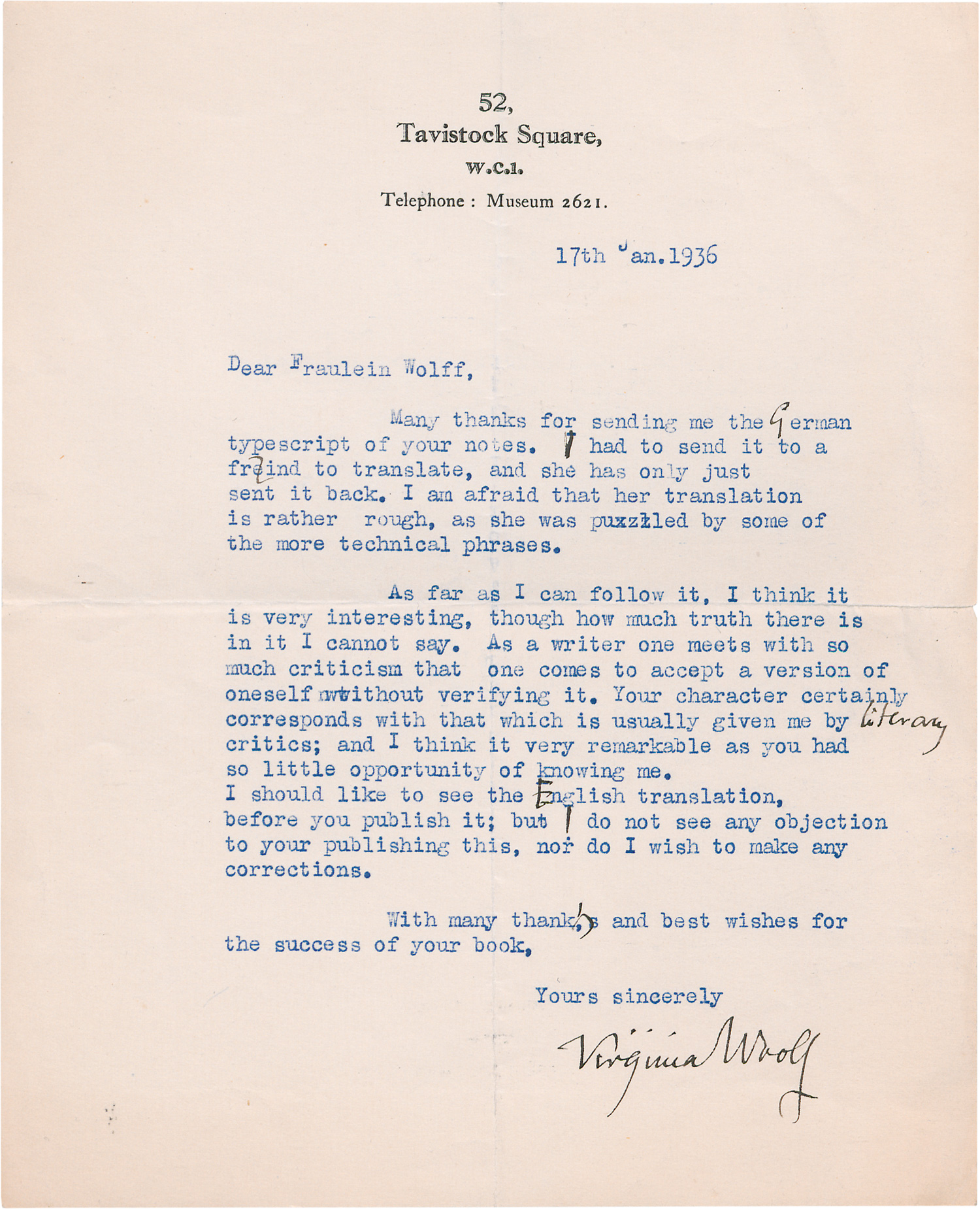 An die Ärztin, Sexualwissenschaftlerin und Schriftstellerin Charlotte Wolff (1897-1986), die in diesem Jahr aus Deutschland emigrieren musste. Sie hatte Virginia Woolf wohl das deutsche Typoskript ihres Buches über Chirologie gesandt, das dann unter dem Titel "Studies in Handreading" 1936 in London bei Chatto & Windus erschien. Anscheinend hatte Charlotte einen Handabdruck von Virginia erhalten und daraus Charakterzüge abgeleitet. Virginia bedankt sich und äußert einige Gedanken zu dem Text. "... Many thanks for sending me the German typescript of your notes. I had to send it to a friend to translate, and she has only just sent it back ... As far as I can follow it, I think it is very interesting, though how much truth there is in it I cannot say. As a writer one meets with so much criticism that one comes to accept a version of oneself without verifying it. Your character certainly correspondends with that which is usually given me by literary critics; and I think it very remarkable as you had so little opportunity of knowing me. I should like to see the English translation, before you publish it; but I do not see any objection to your publishing this ...". - Faltenriss an der rechten Seite. - Selten.