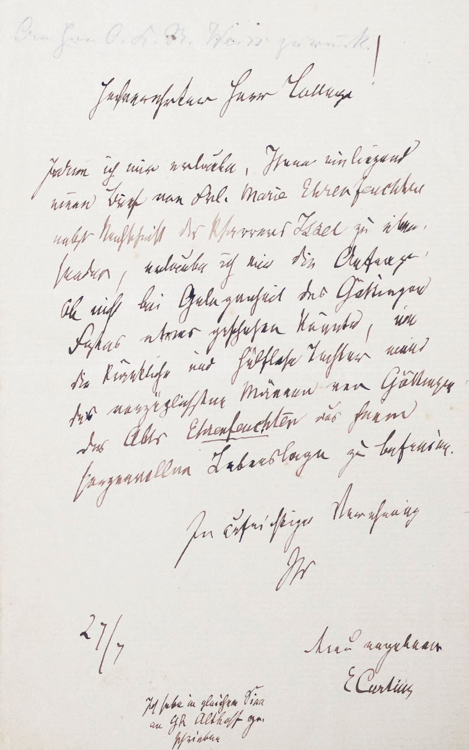 An einen Kollegen, wohl den Theologen Bernhard Weiss, in Göttingen. "... Indem ich mir erlaube, Ihnen einliegend einen Brief von Frl. Maria Ehrenfeuchter nebst Nachschrift des Pfarrers Issel zu übersenden, erlaube ich mir die Anfrage: Ob nicht bei Gelegenheit des Göttinger Festes etwas geschehen könnte, um die kränkliche und hülflose Tochter eines der vorzüglichsten Männer von Göttingen, des Abts Ehrenfeuchter, aus jener sorgenvollen Lebenslage zu befreien ... Ich habe in gleichem Sinn an GR Althoff geschrieben." - Der lutherische Theologe Friedrich Ehrenfeuchter (1814-1878) war Professor in Göttingen und ab 1856 Abt des Klosters Bursfelde gewesen. Der höchst einflußreiche Jurist und Bildungspolitiker Geheimrat Friedrich Althoff (1839-1908) wurde 1901 von der Göttinger Gesellschaft der Wissenschaften zum Ehrenmitglied ernannt.