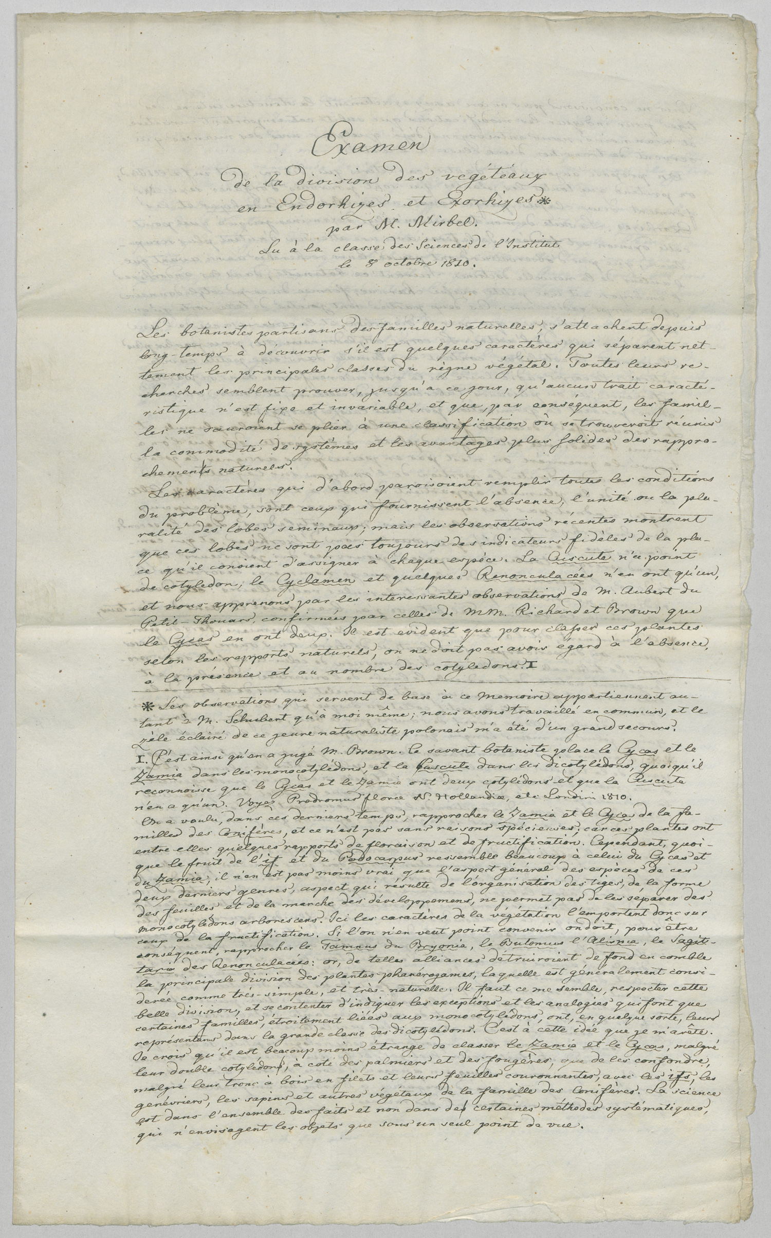 "Examen de la division des végétaux en Endorhiyes et Exorhiyes. par M. Mirbel. Lu à la classe des Sciences de l'Institut le 8 Octobre 1810." Sorgfältige Reinschrift, vermutlich von Schreiberhand. Die fehlerfreie, attraktive Gestaltung des Textes auf festem Bütten läßt eine Verwendung des umfangreichen wissenschaftlichen Manuskripts als Geschenk oder zu einem anderen repräsentativen Zweck vermuten. - Gefaltet.