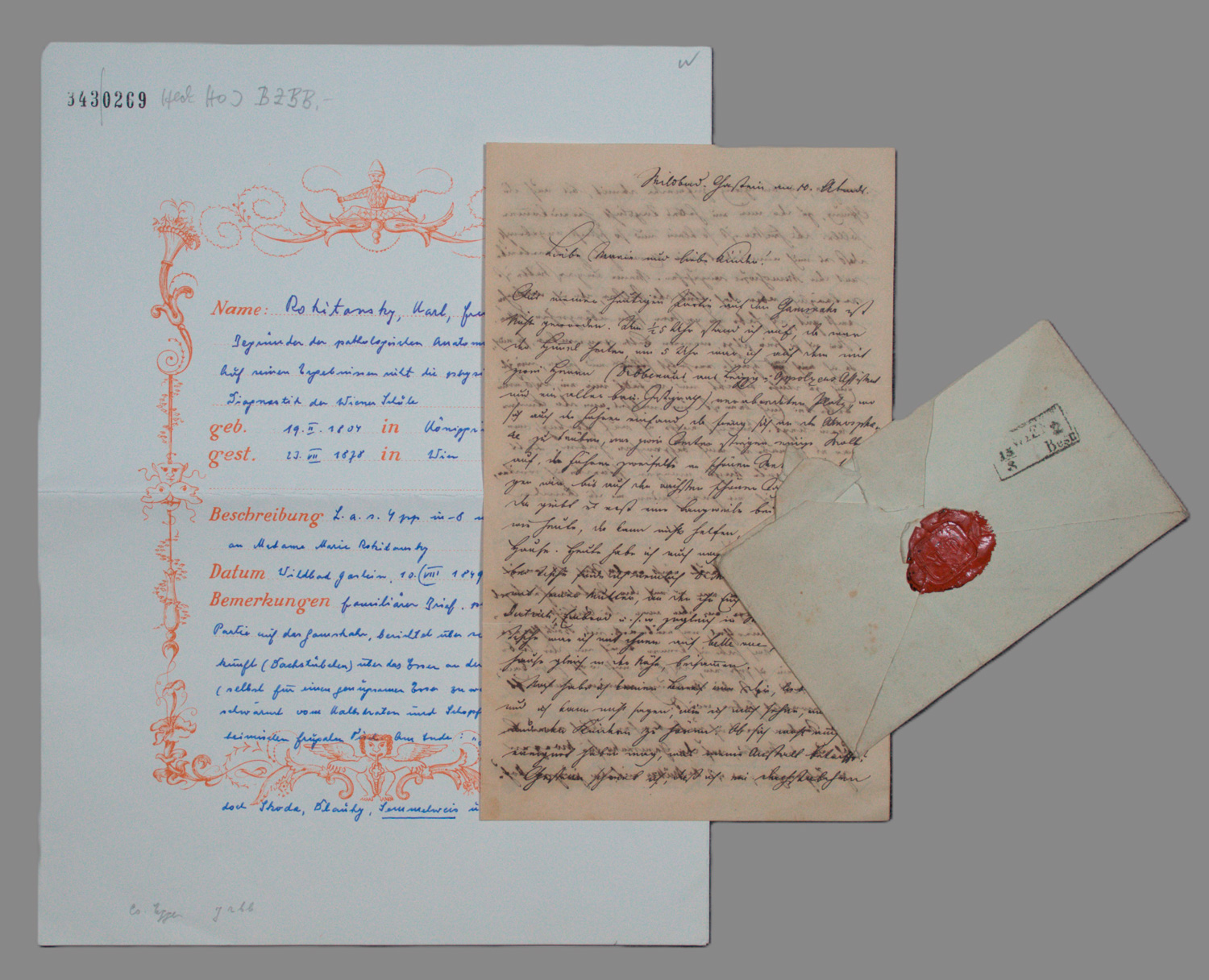 Umfangreicher Brief an seine Familie, mit Schilderungen seines Urlaubs: Er plant eine Partie auf das Gamskar, berichtet über seine Unterkunft (Dachstübchen), über das Essen an der Table d'Hôte (selbst für einen genügsamen Esser zu wenig), schwärmt von Kalbsbraten und Schopfbraten am heimischen Tisch und spricht weitere Themen an, z. B. den Ausbruch der Cholera in Wien. "... Soeben werde ich unterbrochen durch einen Besuch, um die Partie auf den Gamskahr für morgen zu besprechen; es ist Dr. Müller mit dem jungen Hofmannsthal (Bernhards Sohn), einem ... lieben Bürschel". Am Schluss Grüße an Kollegen und Freunde, darunter Josef von Skoda und Ignaz Semmelweis. - Rokitansky war 1844 in Wien zum ersten Ordinarius für Pathologische Anatomie im deutschsprachigen Raum ernannt worden. Schon 1827 war er an der Obduktion Beethovens beteiligt. Durch seine Frau, die Sängerin Maria Anna Weiss, Schülerin Salieris, und durch zwei seiner Söhne, die beide gleichfalls Sänger wurden, stand Rokitansky mit großen Komponisten wie Schubert und Liszt in Verbindung. - Das Papier etwas gebräunt.