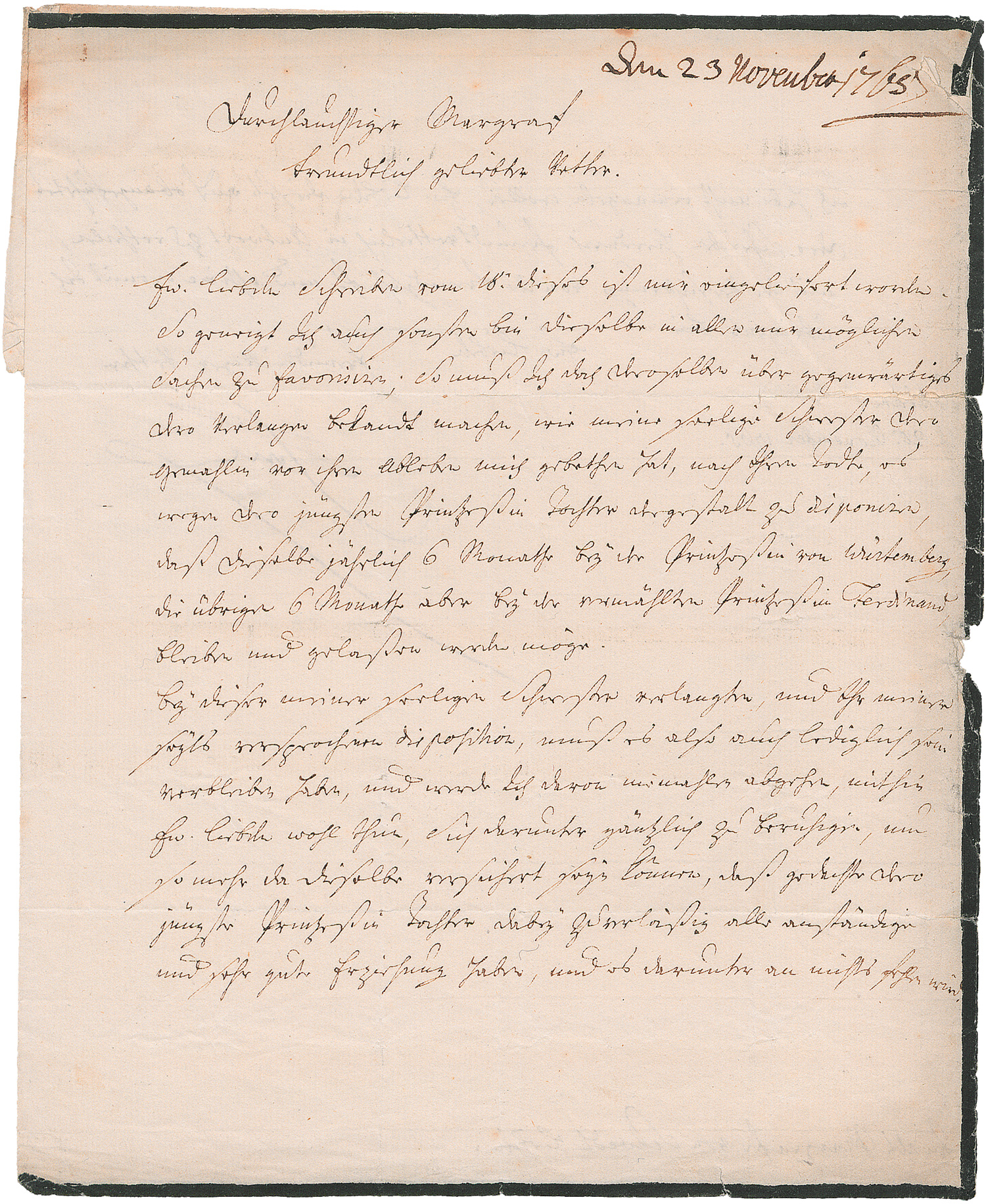 An seinen ungeliebten Schwager, den Markgrafen Friedrich Wilhelm von Brandenburg-Schwedt (1700-1771), den er am Schluß als "Ew liebden freundwilliger Vetter" grüßt. Eine Woche zuvor war des Königs Schwester Sophie von Preußen, die Gemahlin des Markgrafen, verstorben und hatte Verfügungen hinterlassen, betreffend die Erziehung ihrer jüngsten Tochter Philippine. Der Markgraf und seine beiden Brüder hatten nach der Testamentseröffnung eigene Wünsche bezüglich der Zukunft der jetzt nicht mehr unmündigen, sondern mit 21 Jahren volljährigen Philippine geäußert und dem König mitgeteilt. In vorliegendem Brief lehnt der König das Anliegen ab und ordnet energisch das Vorgehen nach dem Willen der Verstorbenen an. "... So muß Ich doch deroselben über gegenwärtiges Dero Verlangen bekandt machen, wie meine seelige Schwester Dero Gemahlin vor ihrem Ableben mich gebethen hat, nach Ihrem Todte, es wegen Dero jüngster Printzeßin Tochter dergestalt zu disponiren, daß dieselbe jährlich 6 Monathe bey der Printzeßin von Wirtemberg, die übrigen 6 Monathe aber bey der vermählten Printzeßin Ferdinand bleibe und gelaßen werden möge. - Bey dieser meiner seeligen Schwester verlangten und Ihr meinerseyts versprochenen disposition, muß es also auch lediglich sein verbleiben haben, und werde ich davon niemahlen abgehen, mithin Ew liebden wohl thun, Sich darunter gäntzlich zu beruhigen, um so mehr da Dieselben versichert seyn können, daß gedachte dero jüngste Printzeßin Tochter dabey zuverläßig alle anständige und sehr gute Erziehung haben, und es darunter an nichts fehlen wird ...". - Sowohl Philippines Mutter Sophie als auch ihr Oheim Friedrich der Große waren wohl daran interessiert, die Tochter dem Einfluss des problematischen Charakters ihres Vaters zu entziehen. Der König zeigt hier deutlich eine wohlwollend-erzieherische Fürsorge für seine Nichte, die wohl in dem guten Verhältnis zu seiner Schwester und dem schlechten Verhältnis zu seinem Schwager begründet ist. - Zwei größere und einige kleinere Faltenrisse.