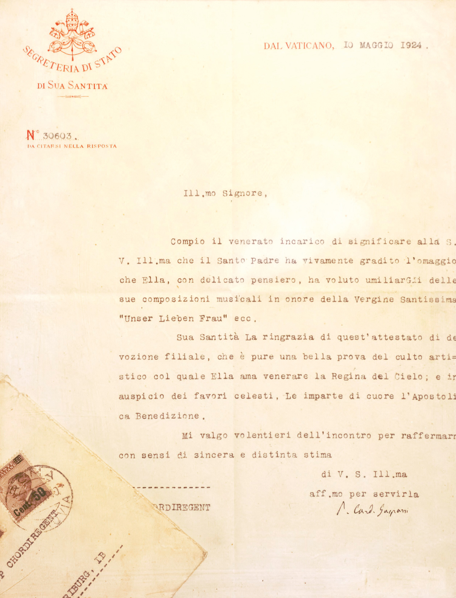 An den deutschen Kirchenmusiker und Komponisten Franz Philipp (1890-1972), der dem Papst eine Komposition zu Ehren Mariens übersandt hatte. Von Gasparris Antwort im Auftrag des Papstes Pius XI. ist auf der Rückseite des Rahmens eine deutsche Übersetzung montiert, in der es u. a. heißt, "dass der Heilige Vater gerührt war über die Ehre, die Sie ihm in so feiner Weise erwiesen haben, indem Sie ihm Ihre musikalische Komposition zu Ehren der heiligsten Jungfrau, unserer lieben Frau, zugewendet haben ... zu den himmlischen Belohnungen, die Sie dafür erwarten dürfen, erteilt Er Ihnen von Herzen den apostolischen Segen ...".