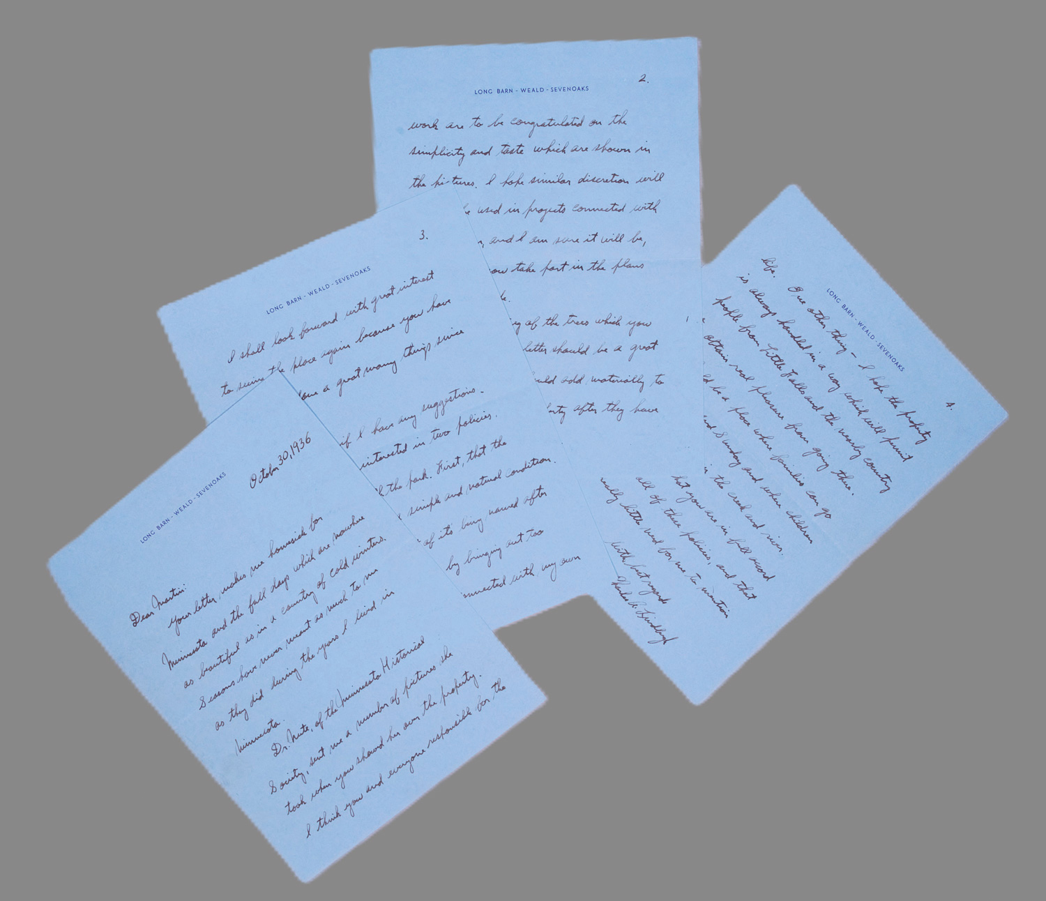 An einen Freund in den USA; ausführlich und sehr sympathisch über die künftige Verwaltung seines ererbten Anwesens in Minnesota. "... Your letter makes me homesick for Minnesota and the fall days which are nowhere as beautiful as in a country of cold winters. Seasons have never meant as much to me as they did during the years I lived in Minnesota. Dr. Nute, of the Minnesota Historical Society, sent me a number of pictures she took when you showed her over the property ...". Mit ähnlicher Diskretion wie die qualitätvollen Bilder sollen auch die nunmehr gefassten Pläne für die alte Farm verwirklicht werden. "... The planting of the trees which you mention ... should be a great improvement and should add materially to the beauty of the property after they have had a few years to grow ... I am especially interested in two policies ... First, that the property be left in a simple and natural condition. Second, that the fact of its being named after my father be not lost by bringing out too prominently incidents connected with my own life ... I hope the property is always handled in a way which will permit people from Little Falls and the nearby country to obtain real pleasure from going there. It should be a place where families can go on Saturday and Sunday and where children can enjoy playing in the creek und river ...". - Geschrieben vier Jahre nach der weltbewegenden Entführung und Ermordung seines Kindes, die Lindbergh bewog, mit der Familie nach England überzusiedeln.