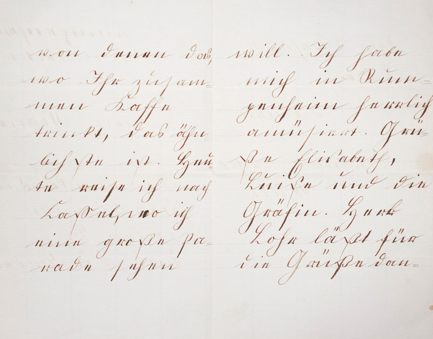 Säuberlich geschriebener Kinderbrief des viereinhalbjährigen Prinzen Wilhelm von Preußen an eine Cousine Marie. "... Ich danke Dir für Deinen lieben Brief und die Bilder, von denen das, wo Ihr zusammen Kaffe trinkt, das ähnlichste ist. Heute reise ich nach Caßel, wo ich eine große Parade sehen will. Ich habe mich in Rumpenheim herrlich amüsiert. Grüße Elisabeth, Luise und die Gräfin ...". Er schließt mit den Worten: "Behalte lieb Deinen treuen Vetter Willy".