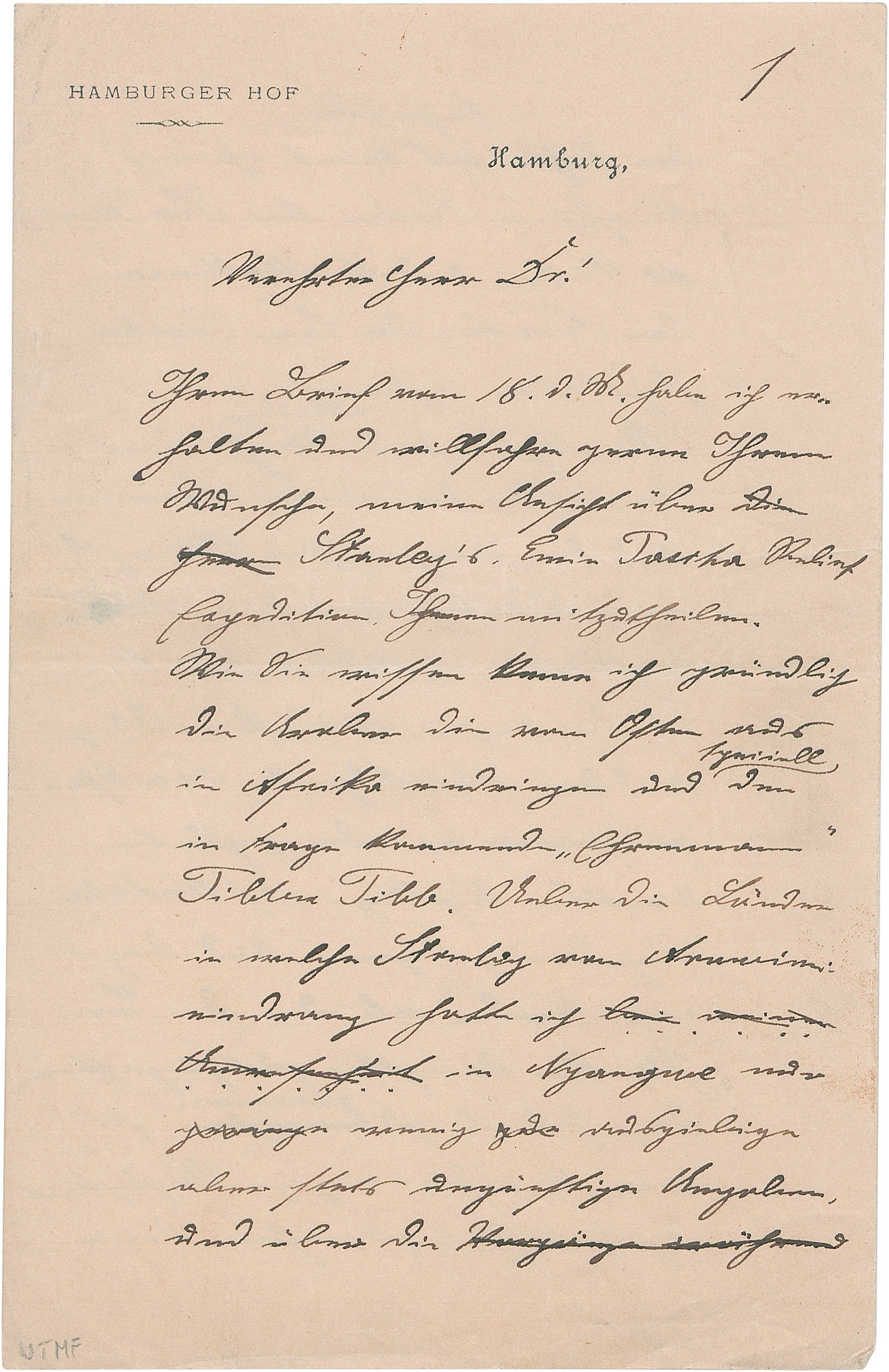 Wohl an einen Journalisten. Sehr umfangreicher Brief, in dem Wissmann ausführlich die vielen Wirren und Unternehmungen zur Rettung des (aus Schlesien stammenden) in ägyptischen Diensten stehenden Emin Pascha schildert, der durch den Mahdi-Aufstand seine Verbindungen zum Norden Afrikas verloren hatte und seine Stellung als Gouverneur der Provinz Äquatoria gewaltsam einzubüßen drohte. Wissmann beschreibt die vielfältigen Aktivitäten der deutschen Afrika-Reisenden und der europäischen Staaten sowie Henry Morton Stanleys Rolle bei den Rettungsbemühungen um Emin Pascha, wobei Wissmann sich vor allem über Stanley kritisch äußert. - Wertvolle Quelle zur Erkenntnis der Geschehnisse in den jahrelangen Wirren um die Person Emin Paschas, geschildert von einem unmittelbar Beteiligten.