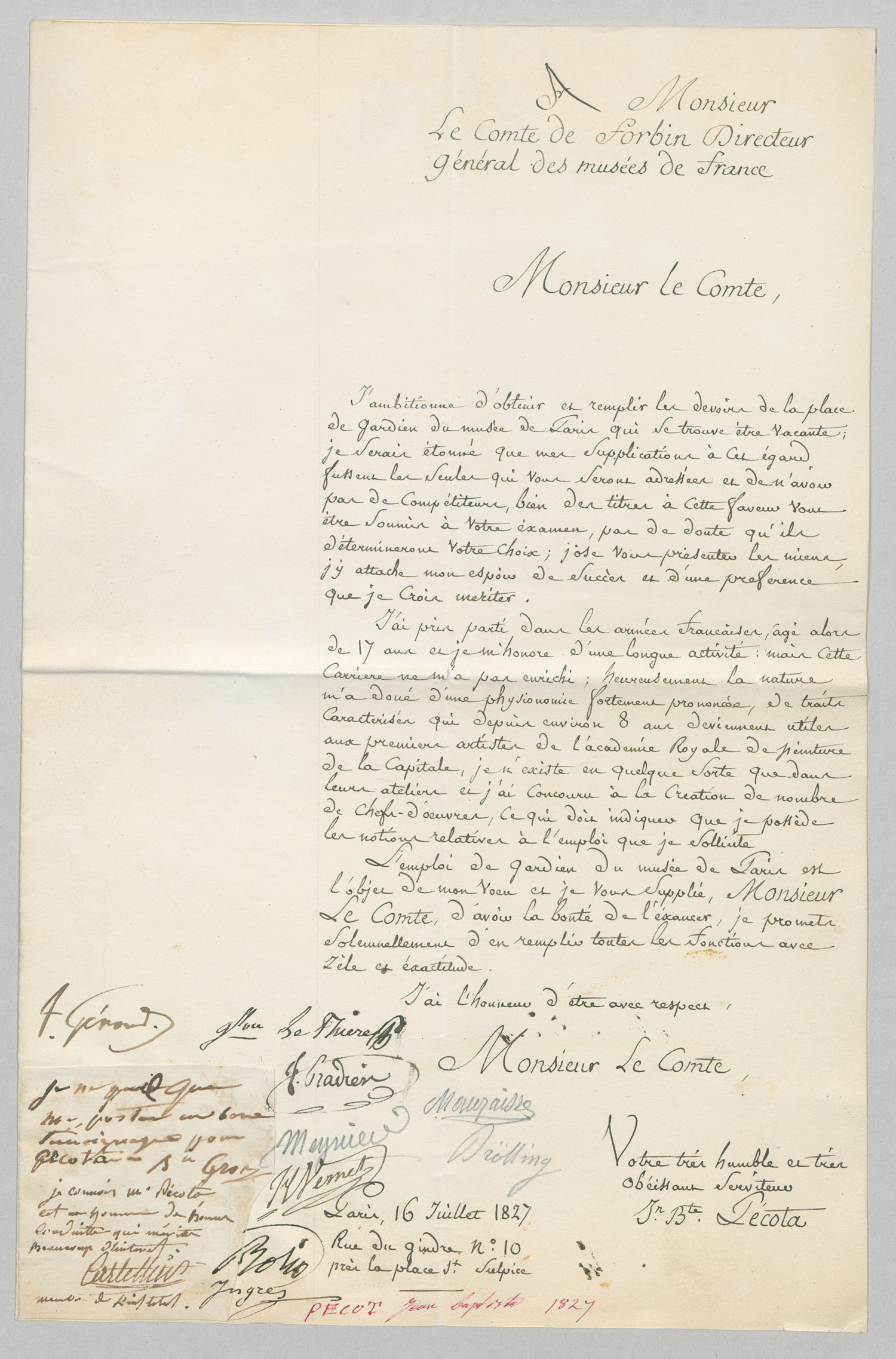 Der Militär-Veteran Jean Baptiste Pécota wendet sich in einem ausführlichen Schreiben an den Comte de Forbin, Generaldirektor der Museen Frankreichs, mit der Bitte um eine Anstellung als Museumswächter in Paris, die zunächst einmal nicht berücksichtigt worden sei. Er habe seit dem Alter von 17 Jahren in der französischen Armee gedient, sei aber trotz seiner langjährigen Dienste nicht zu einem angemessenen Einkommen gelangt. Er habe sich jedoch hervorragend als Modell für die Künstler bewährt: "... heureusement la nature m'a doné [!] d'une physionomie fortement prononcée, de traits caracterisés qui depuis environ 8 ans deviennent utiles aux premiers artistes de l'academie Royale de peinture de la Capitale, je n'existe en quelque Sorte que dans leurs ateliers et j'ai concouru à la Création de nombre de Chefs-d'oeuvres, Ce qui doit indiquer que je possède les notions rélatives à l'emploi que je sollicite ...". - Zum Beweis dieser Aussage bat Pécota offensichtlich alle Künstler, denen er Modell gestanden hatte, seine Eingabe zu unterschreiben. Tatsächlich haben 12 Künstler, zwei sogar mit Empfehlung, das Schreiben unterzeichnet: J.-A.-D. Ingres, Gérard, Gros, Pradier, Horace Vernet, Bosio, Le Thière, Drölling, Mauzaisse, Meynier, Cartellier und Jean Baptiste Pécot. - Sehr ungewöhnliches Dokument der französischen Kunstgeschichte.