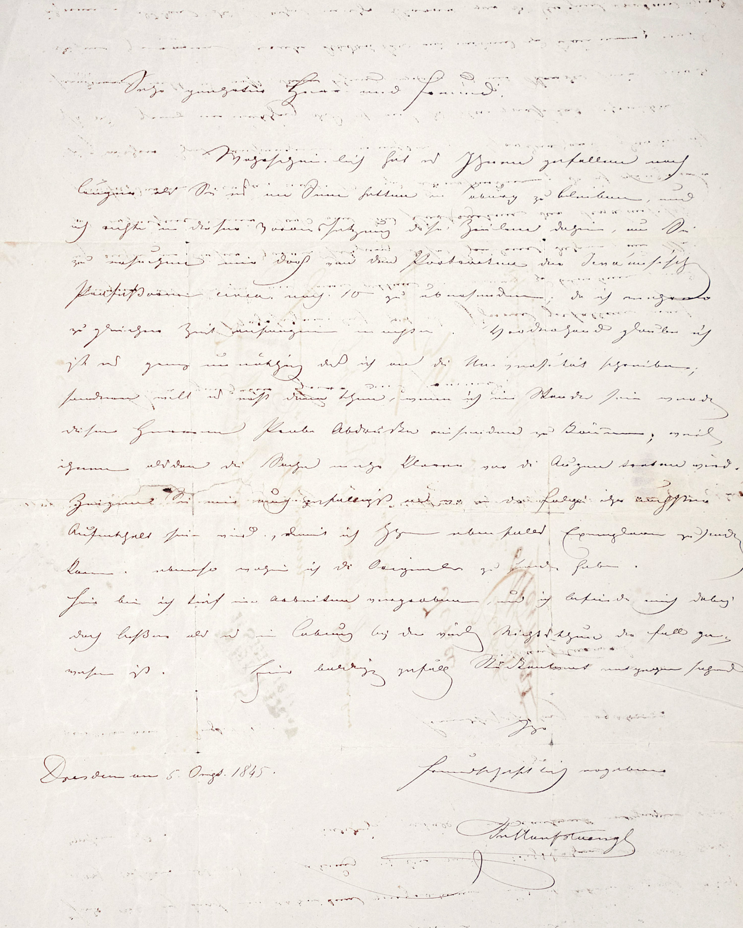 Hanfstaengl, Franz, berühmter Photograph, Lithograph und Kunstverleger, der bedeutendste deutsche Porträt-Photograph des 19. Jhdts (1804-1877). Eigh. Brief m. U. "Fr Hanfstaengl" sowie mit Adresse und Siegelresten. 1 S. Gr. 4to. Dresden 5.IX.1845.