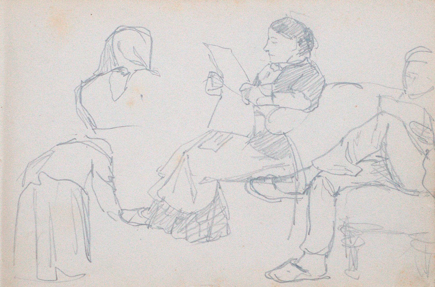 Reich gefülltes Skizzenbuch aus dem 3. Jahr von Hentschels Ausbildung auf der Meissener Zeichenschule, auf dem Vorsatz der Vermerk: "R. Hentschel. 1886". Schon ganz professionell wirkende naturalistische Zeichnungen von Frauen und Männern aus dem Alltag der arbeitenden Bevölkerung. Mit vielen Details der Modelle wie Köpfe, Gliedmaßen, Kleidung und Bewegung. Entsprechend seiner speziellen Begabung war Hentschel in der Porzellanmanufaktur vor allem als Figurenmaler beschäftigt. "Er gehörte gemeinsam mit seinem jüngeren Bruder Konrad Hentschel zu den bedeutendsten Vertretern des Meißener Jugendstils" (Wikip.). - Heftung lose. - Mehrere Beilagen: Ersatzreserve-Paß des Ersatzreservisten Johannes Rudolf Hentschel. XVI, 16 S. Mit vielen handschriftl. Eintragungen. Kl. 8vo. Orig.-Pappbd. Meissen 29.V.1889. - Ersatz-Reserve-Schein für den "Porzellan-Maler Julius Ernst Hentschel, geboren am 23 September 1843", der "wegen Krampfaderbruchs u. Schwäche der Ersatz-Reserve überwiesen" wird. Gedrucktes Formular mit handschriftl. Eintragungen. Liebenwerda 30.VI.1865. - Einzugschein. "Dem Manufacturisten Herrn Ernst Julius Hentschel ... wird auf Ansuchen ... hiermit Erlaubniß ertheilt, in Vorbrücke sich häuslich niederzulassen". Gedrucktes Formular mit handschr. Eintragungen. Meissen, Königl. Sächs. Gerichtsamt, 11.VII.1868. - Genehmigung des Kgl. sächsischen Kämmereramtes für Julius Ernst Hentschel, "Figurenmaler bei der Kgl. Sächs. Porzellan-Manufaktur Meissen", am 22.XI.1906 zur Audienz beim König zu erscheinen. Mit dem als "Königliche Angelegenheit" gekennzeichneten Umschlag. Dresden 17.XI.1906. - Die Bescheinigungen 2 und 3 mit Erhaltungsmängeln.