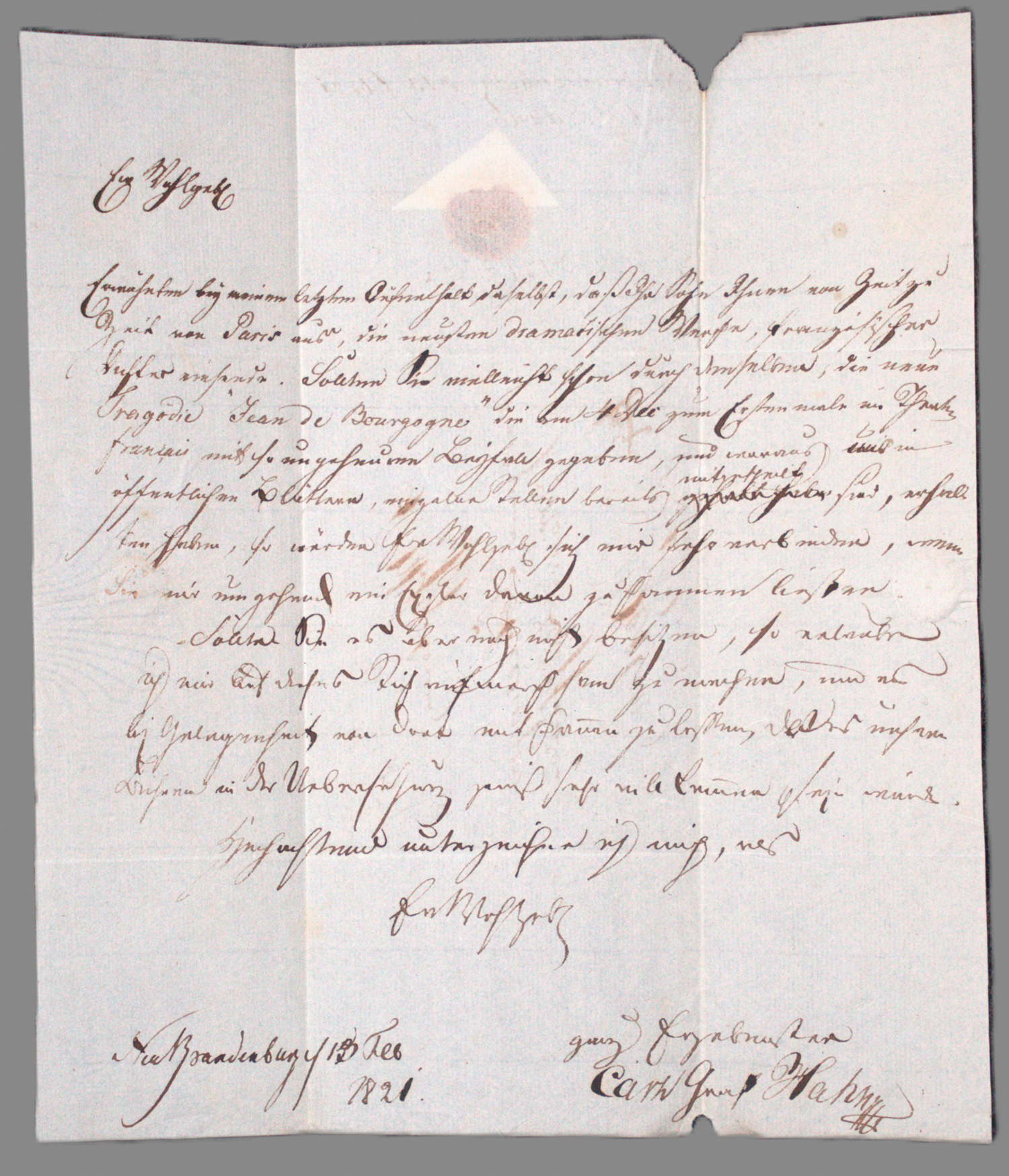 Hahn-Neuhaus, Carl Friedrich Graf von, Theaterdirektor, der hochberühmte "Theatergraf", der als leidenschaftlicher Theaterliebhaber zuerst auf seinem Gut Remplin ein Theater errichtete, dann mit zahllosen Theater-Unternehmungen sein sehr großes Vermögen vollständig "verspielte" (1782-1857). Zur Hälfte eigenhändiger Brief m. U. "Carl Graf Hahn" sowie mit Adresse und Lacksiegel. 1 S. 4to. Neubrandenburg 13.II.1821.