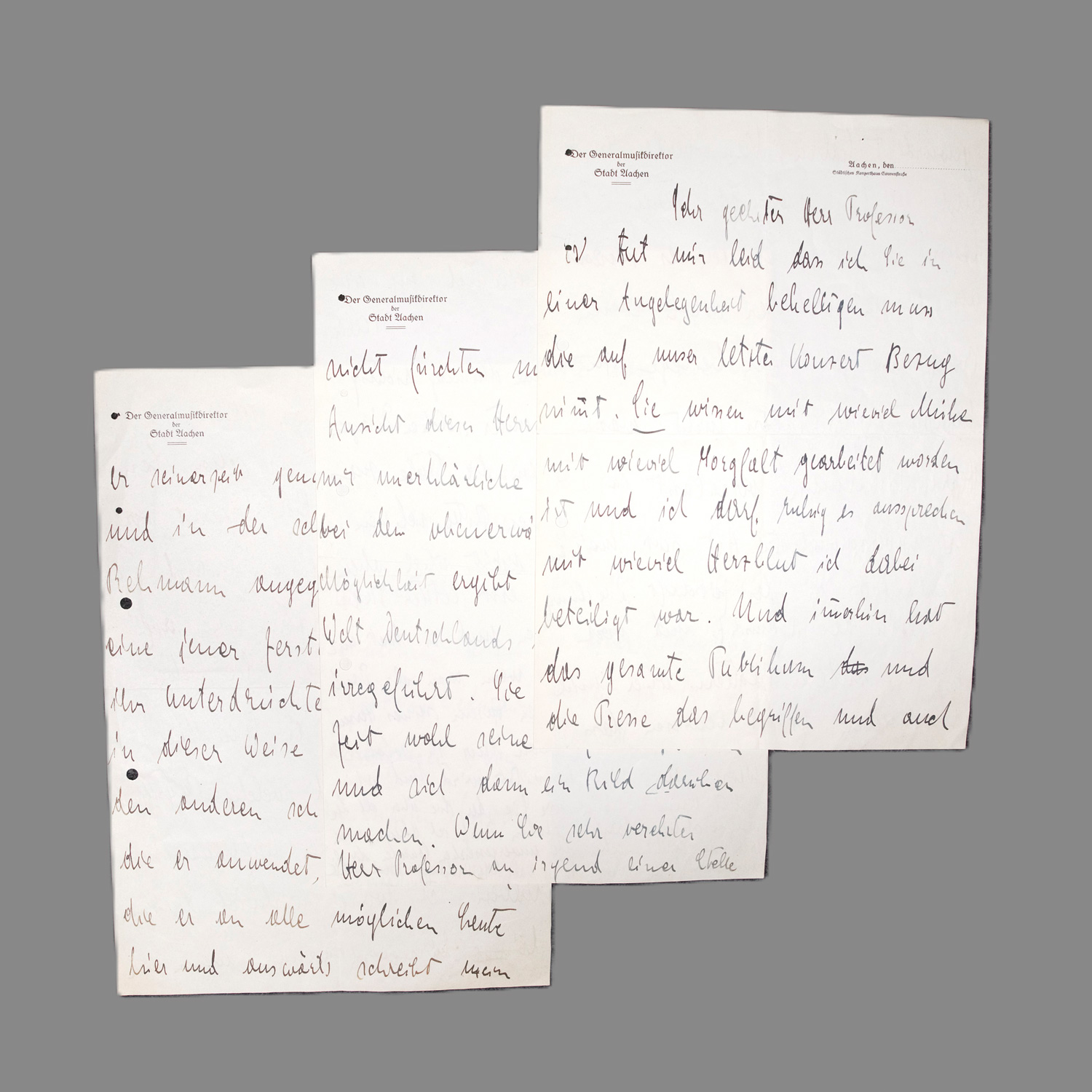Karajan, Herbert von, einer der bedeutendsten und prominentesten Dirigenten des 20. Jhdts (1908-1989). Eigh. Brief m. U. "H. v. Karajan". 6 S. auf 3 Bl. Mit Briefkopf "Der Generalmusikdirektor der Stadt Aachen". Gr. 4to. Aachen (ca. 1936).