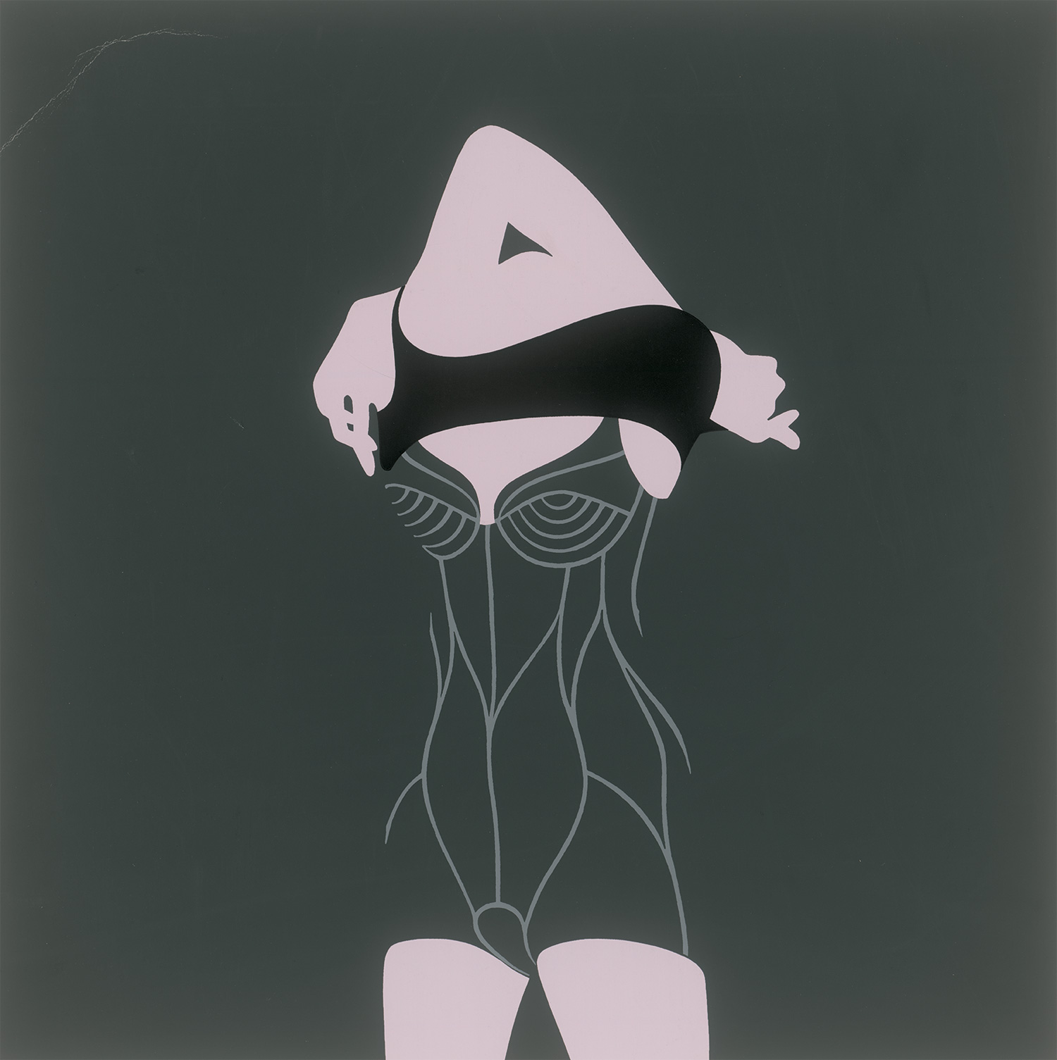 X. E. Bornemann. Siebdruck einer sich entkleidenden Frau, ihres Torsos: Unterwäsche und Korsage freilegend - in reduzierter Darstellung mit Grau und zartem Rosa. - signiert.