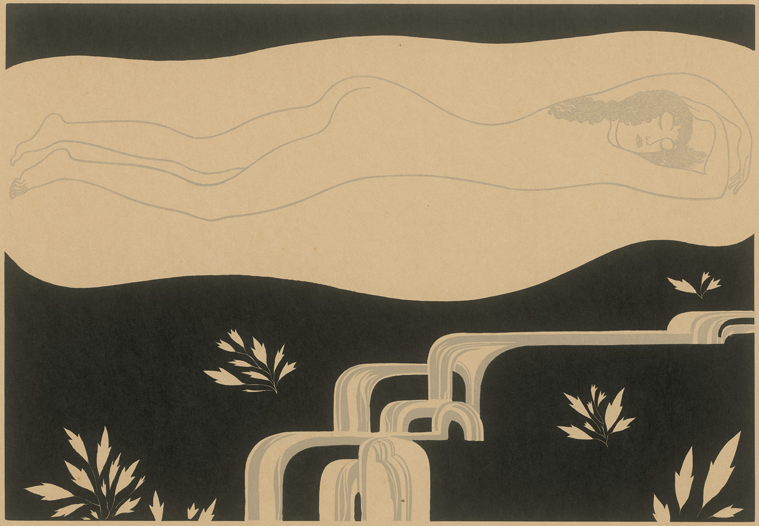 IV. Carl Otto Czeschka. "Am Bache." Ruhende am Wasser. Holzschnitt eines liegenden Mädchens an einem Bach. - Mit grauem Stempel monogrammiert und datiert "1919".