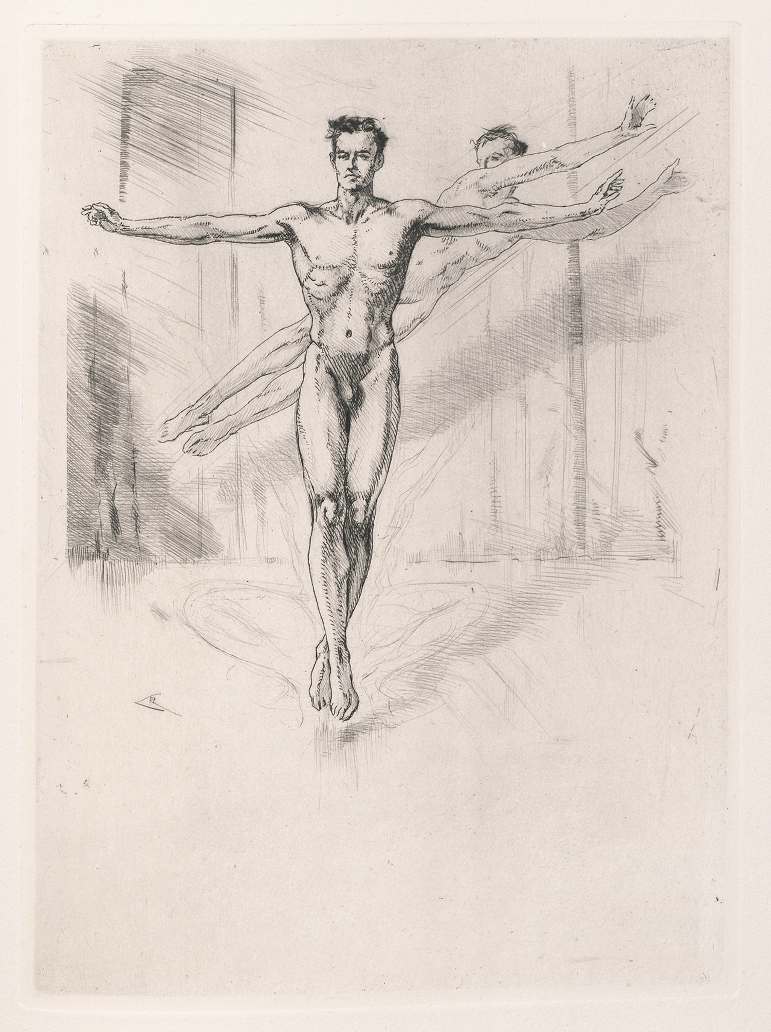 Billy, André. Visions de Danse. Trente compositions dessinées et gravées à la pointe sèche par le peintre et graveur Lobel-Riche. 4 Bl., 93 S., 2 Bl. Mit gestochener TVignette, 30, meist ganzseitigen Original-Kaltnadelradierungen teils auf Tafeln oder im Text sowie 1 Extrasuite mit 26 Tafel-Radierungen mit Remarquen von Alméry Lobel-Riche. 32 x 24 cm. OMaroquin (sign.: Le Douarin) mit goldgeprägtem TSchild im OHalbmaroquinschuber (etwas bestoßen und mit kleinen Einrissen) mit eingebundener OBroschur. Paris, chez l'artiste, 1949.