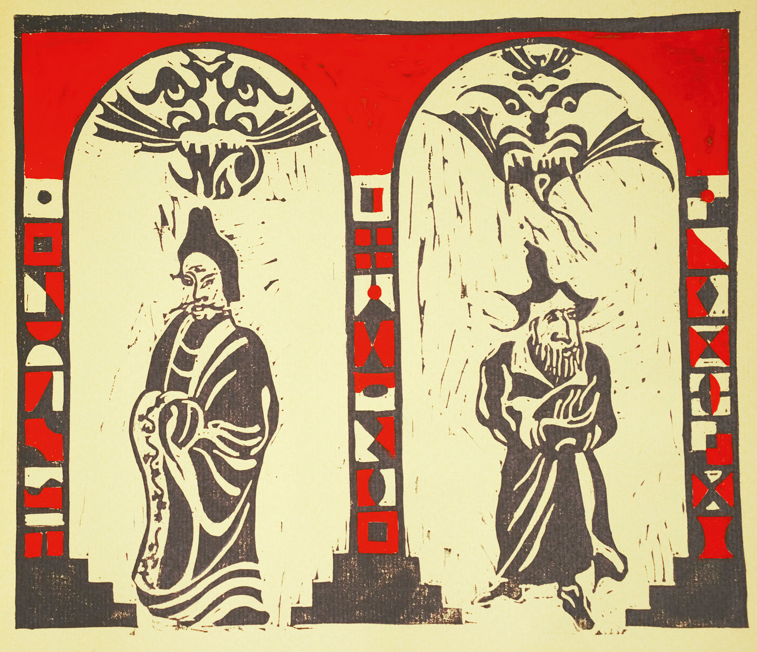 Bock, Dieter und Christine. Zhu Pingnam. Der Drachentöter. 9 Bl. (3 doppelblattgroß) auf farbigem Papier, komplett in (Farb)Holzschnitt gedruckt. 31 x 31 cm. Illustrierte OBroschur (schwach fleckig und berieben, mit leichten Randknicken; als Blockbuch gebunden). (Wohl Dresden, um 1980).