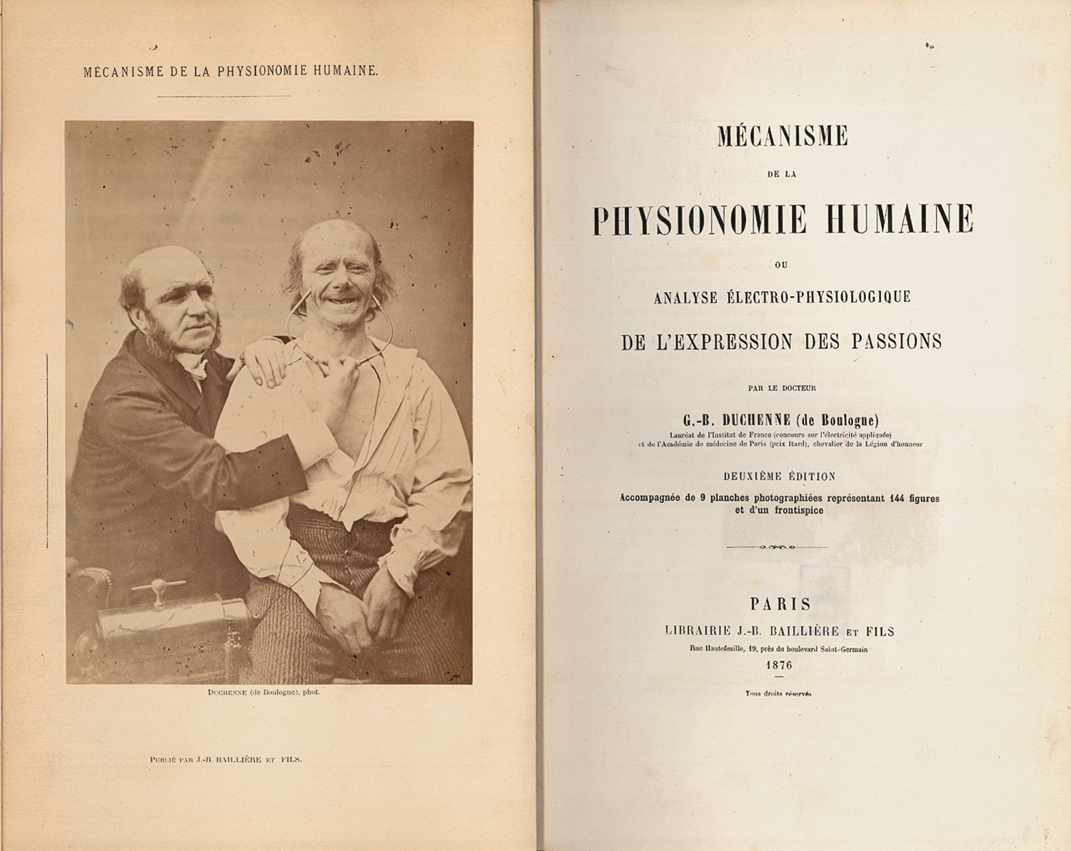 Duchenne de Boulogne, G(uillaume)-B(enjamin). Mécanisme de la Physionomie humaine ou analyse électro-physiologique de l'expression des passions. Deuxième edition. XII, S. VI-XI, 67, 196 S. (so vollständig). Mit fotografischem Frontispiz und 9 Tafeln als Albuminabzüge. 28 x 19,5 cm. Halbleder d. Z. (Kapital lädiert und stellenweise erneuert, berieben und etwas bestoßen) mit RVergoldung und goldgeprägtem RTitel. Paris, Libraire J.B. Baillière et fils, 1876.