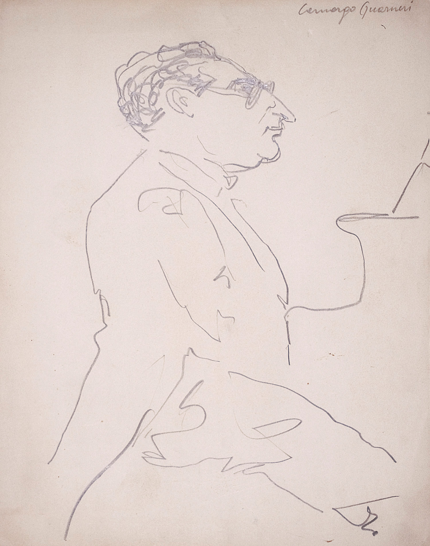 Die Zeichnung zeigt den brasilianischen Komponisten Camargo Guarnieri (1907-1993). Er war Mitglied der Mitglied der Academia Brasileira de Música, war der Direktor des Conservatório Dramático e Musical in São Paulo und wurde von der Organisation Amerikanischer Staaten mit dem Gabriela-Mistral-Preis ausgezeichnet und erhielt den Titel "Größter zeitgenössischer Komponist der drei Amerikas". Vom Künstler signiert und betitelt. – Papierbedingt leicht gebräunt, leicht braunfleckig sonst dekorativ.