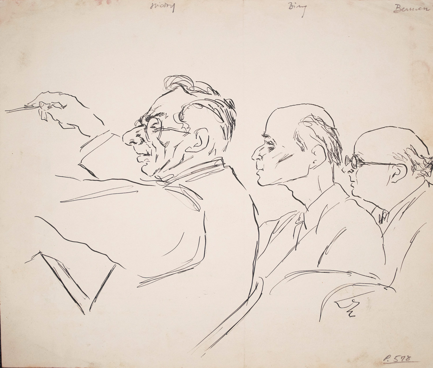 Die Zeichnung zeigt fünf Mitglieder der Metropolitan Opera, den Komponisten und Dirigenten Fritz Stiedry (1883-1968), den Chor-Direktor und Dirigenten Kurt Adler (1907-1977), den Assistant Manager John Gutman (1902-1992), den Komponisten Karol Rathaus (1895-1954) und den Direktor Konstantinos Yannopoulos (1919-2003). Vom Künstler unten rechts signiert. – Mit Mittelfalz. Papierbedingt leicht gebräunt, etwas finger- und feuchtfleckig. – Dabei: Derselbe. Portrait von Fritz Stiedry, Rudoph Bing, Eugene Berman. Signierte Original-Tuschezeichnung auf Papier. 27 x 40 cm (Darstellung) bzw. 35 x 41 cm (Blatt). Um 1950.