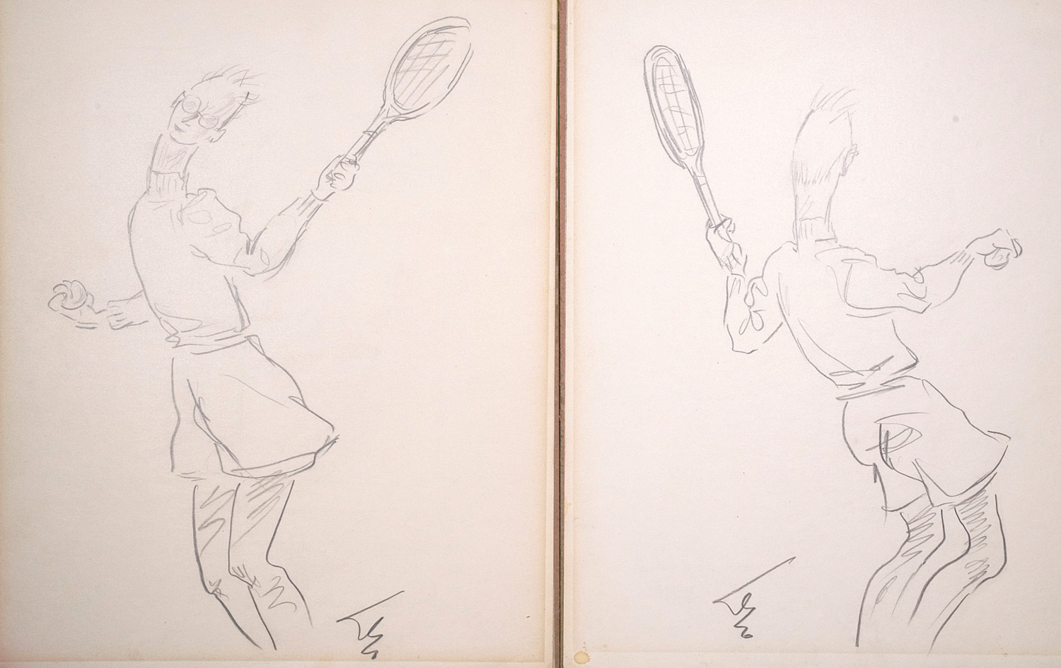 Karikative Darstellung eines Tennisspielers in der Vorder- und Rückansicht. Jeweils unten rechts signiert. – Etwas lichtrandig und mit winzigen Gebrauchsspuren. Dekorativ.