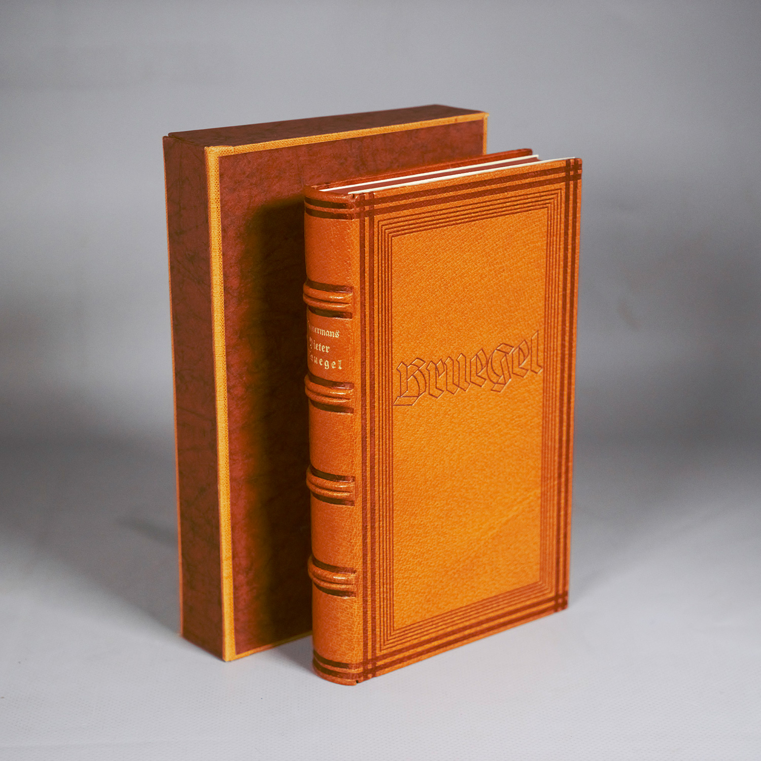 Dorfner, Otto (Werkstatt). - Timmermanns, Felix. Pieter Bruegel. Übersetzt von Peter Mertens. 25.- 34. Tausend. 319 S., 2 B. Mit zahlreichen Holzschnitt-Illustrationen. 21 x 12 cm. Brauner Schweinslederband mit goldgeprägtem RTitel, siebenfachen Deckelfileten und blindgeprägtem Deckeltitel in Halbleinenschuber. Leipzig, Insel, (1934). - Tadelloser Handeinband aus der Dorfner-Werkstatt.