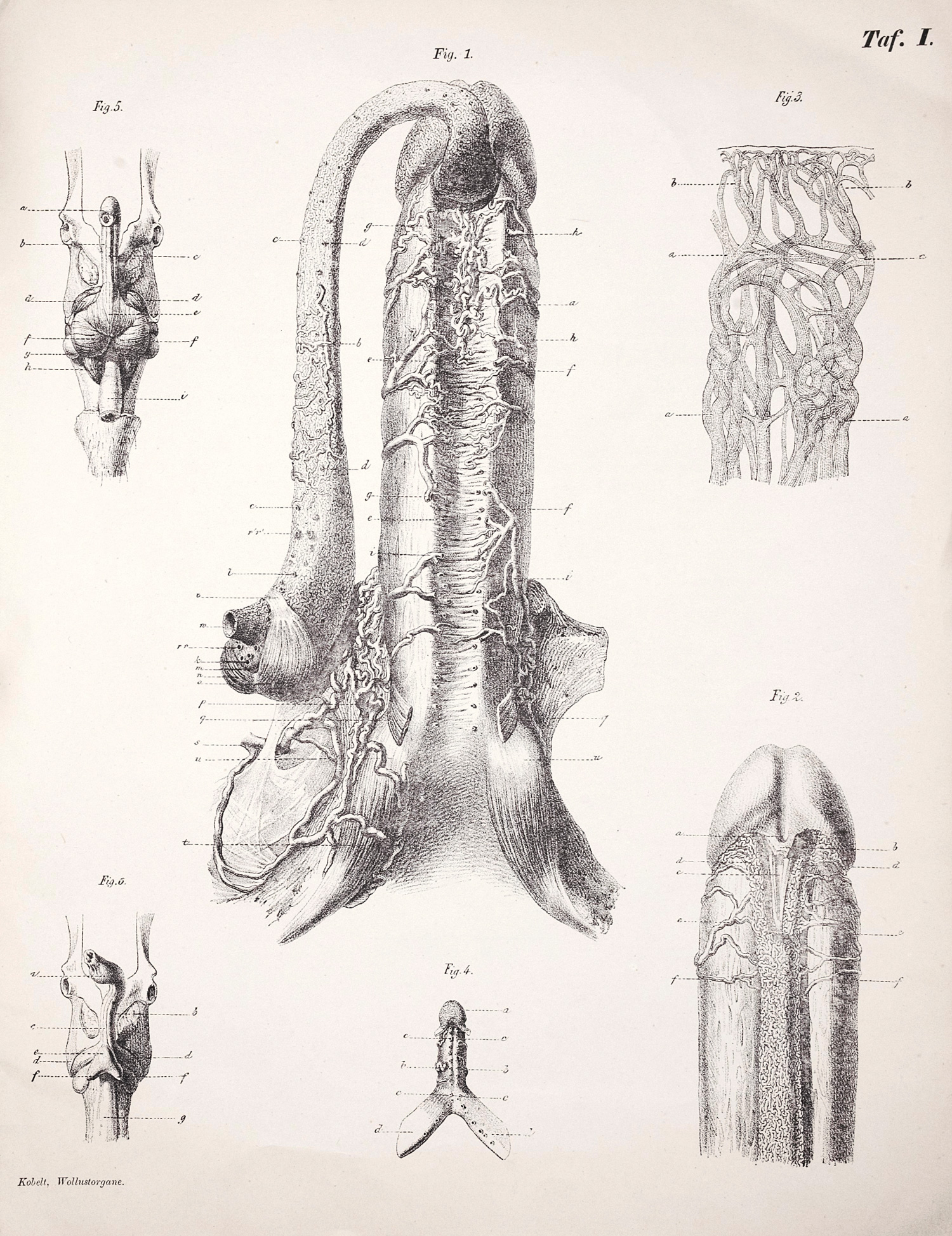 Kobelt, Georg Ludwig. Die männlichen und weiblichen Wollust-Organe des Menschen und einiger Säugethiere in anatomisch-physiologischer Beziehung. 3 Bl., 61 S., 2 Bl. Mit 5 Lithographischen Tafeln. 33 x 25 cm. Broschur d. Z. (berieben, mit Einrissen, knickspurig und fleckig). Freiburg, Adolph Emmerling, o. J. (1844).