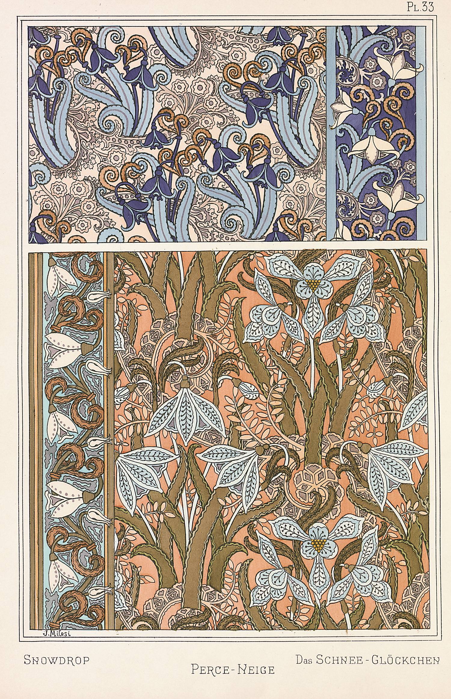 Garvey-Wick 49. Brand-Evers 2208. – Einzige Ausgabe. Die vorliegende Jugendstil-Publikation enthält alle 144 auf chamoisfarbenen Karton gedruckten Tafeln (1. und 2. Serie) dieser seltenen Ornamentsammlung, die von dem schweizerisch-französischen Bildhauer, Maler und Illustrator Eugène Samuel Grasset (1845-1917) publiziert wurde. Dieser studierte zwischen 1861 und 1863 Architektur in Zürich bei Gottfried Semper. 1871 übersiedelte Grasset nach Paris und unterrichtete u. a. Augusto Giacometti, Paul Follot, Maurice Pillard Verneuil, Paul Berthon und Eliseu Visconti. Zusammen mit seinen handverlesenen Schülern konzipierte Grasset auch die vorliegende Sammlung. Die Tafeln sind mit Bildunterschriften in französischer, englischer und deutscher Sprache ergänzt. – Leicht gebräunt; insgesamt sehr schöne, wohlerhaltene Folge mit farbfrischen Drucken. Tafel I/28 doppelt vorhanden.