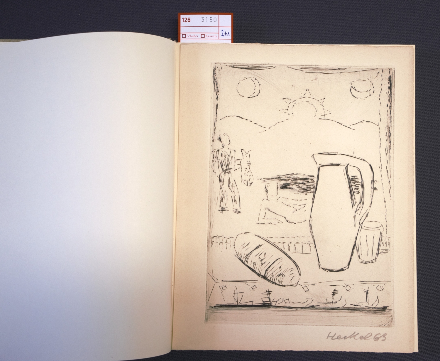 – Der Titel von Bd 1, die Lithographie und die Radierung lose. Bei vorliegendem Exemplar ist die Numerierung im Druckvermerk geschwärzt. – Dabei: Band II in der nummerierten Normalausgabe ((550 Ex.) beigegeben. - Nahezu verlagsfrisch.