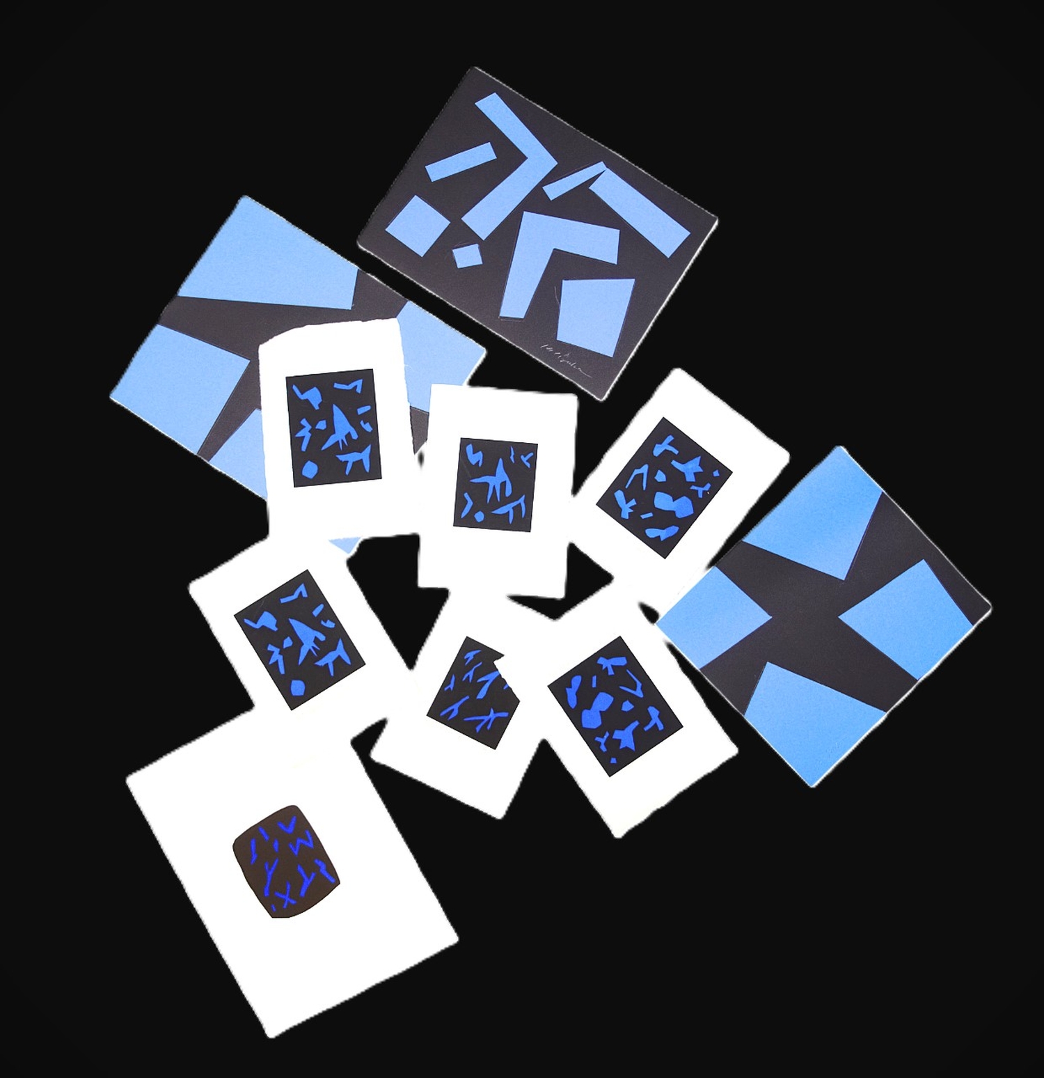 Kleine Serie aus sieben Einzelblättern, jeweils in einer Auflage von 25 Exemplaren gedruckt. Die reduzierten, abstrakten Kompositionen zeigen zeichenhafte Elemente in tiefem Ultramarinblau, die auf monochrom-schwarzen Farbfeldern zu schweben und beinahe zu vibrieren scheinen. – Entlang der äußeren Blattkanten vereinzelt geringfügige Abnutzungsspuren, leichte Bereibungen sowie minimale Knicke. Insgesamt befinden sich die Blätter in gutem bis sehr gutem Zustand. – Beigegeben: Derselbe. 3 abstrakte Scherenschnitte mit Kartonpapieren in Anlehnung an die oben genannte Serie "Space" in Ultramarinblau und Schwarz, unten in Bleistift signiert. 20 x 26,5 cm und ca. 20,5 x 23 cm (2). Um 1993. - Durchbrochene Kartonbilder mit skulpturaler Wirkung.