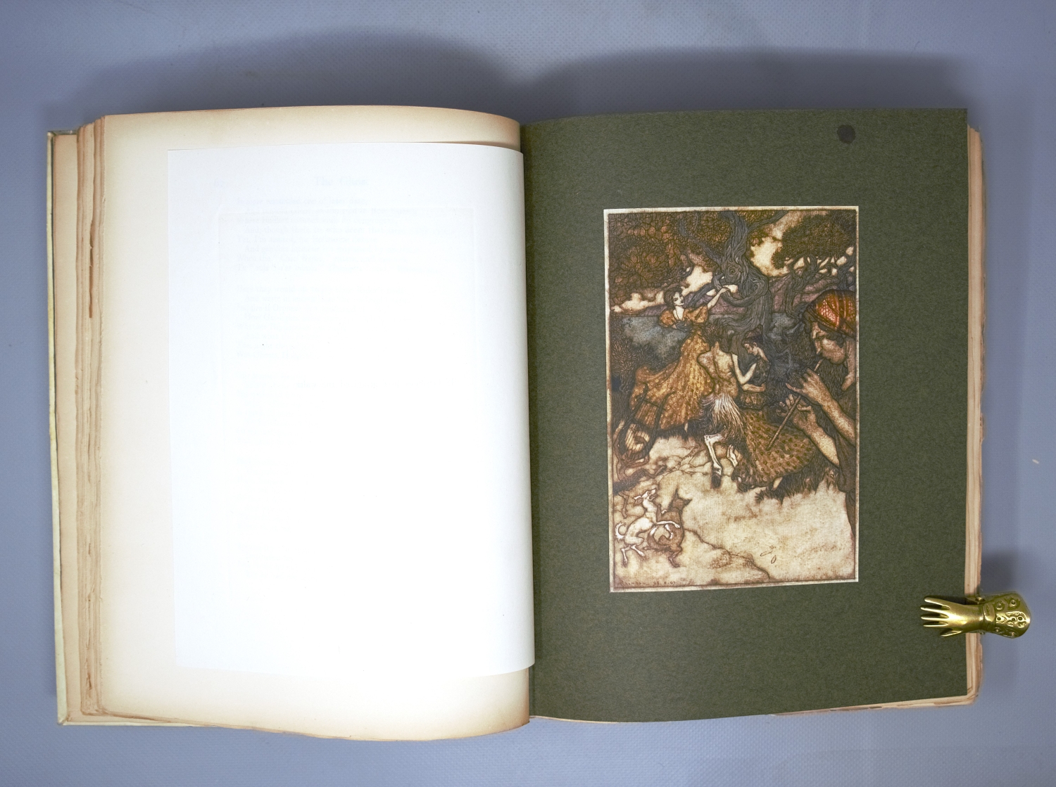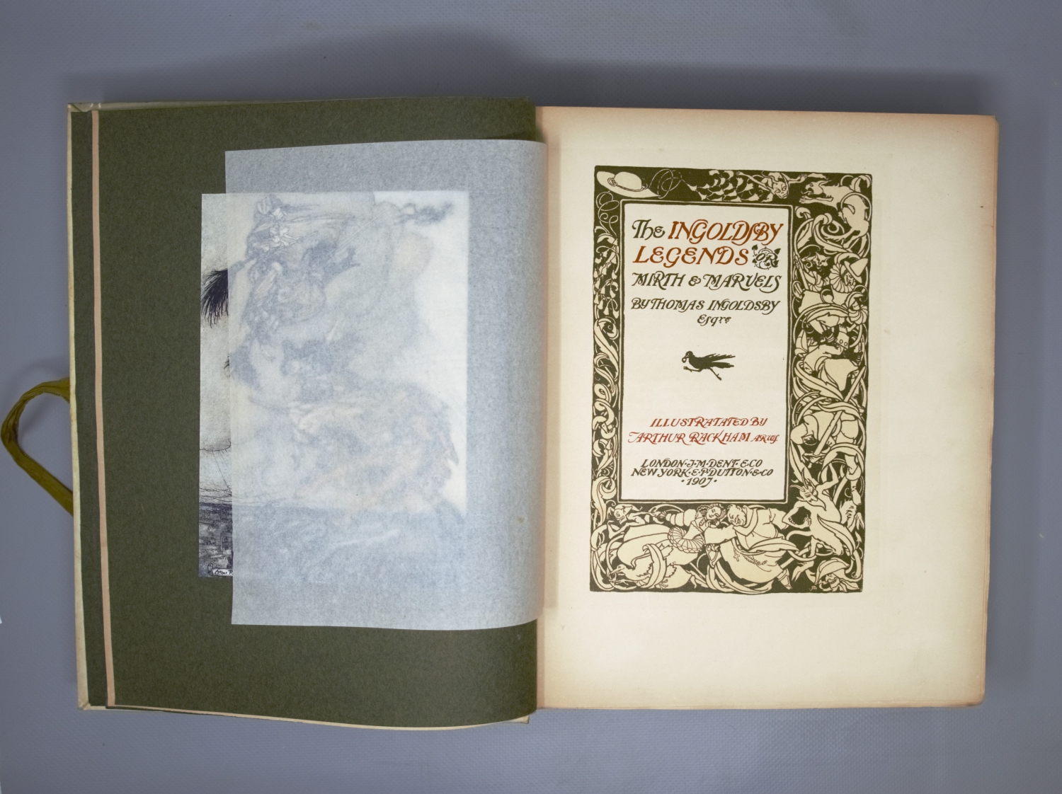 Ingoldsby, Thomas (d. i. Richard Harris Barham). The Ingoldsby Legends or Mirth & Marvels. XIX, 548 S, 1 Bl. Mit 36 teils montierten Farbtafeln, zahlreichen Textillustrationen und Buchschmuck nach Arthur Rackham. 26 x 20 cm. OLeinenband (bestoßen, Kanten berieben, leicht fleckig) mit goldgeprägtem RTitel, RVergoldung sowie goldgeprägtem VDeckeltitel und VDeckelillustration in modernem Leinenschuber (dieser bestoßen und leicht fleckig) mit 2 Schließbändern. London und New York, Dent bzw. Dutton, 1907.