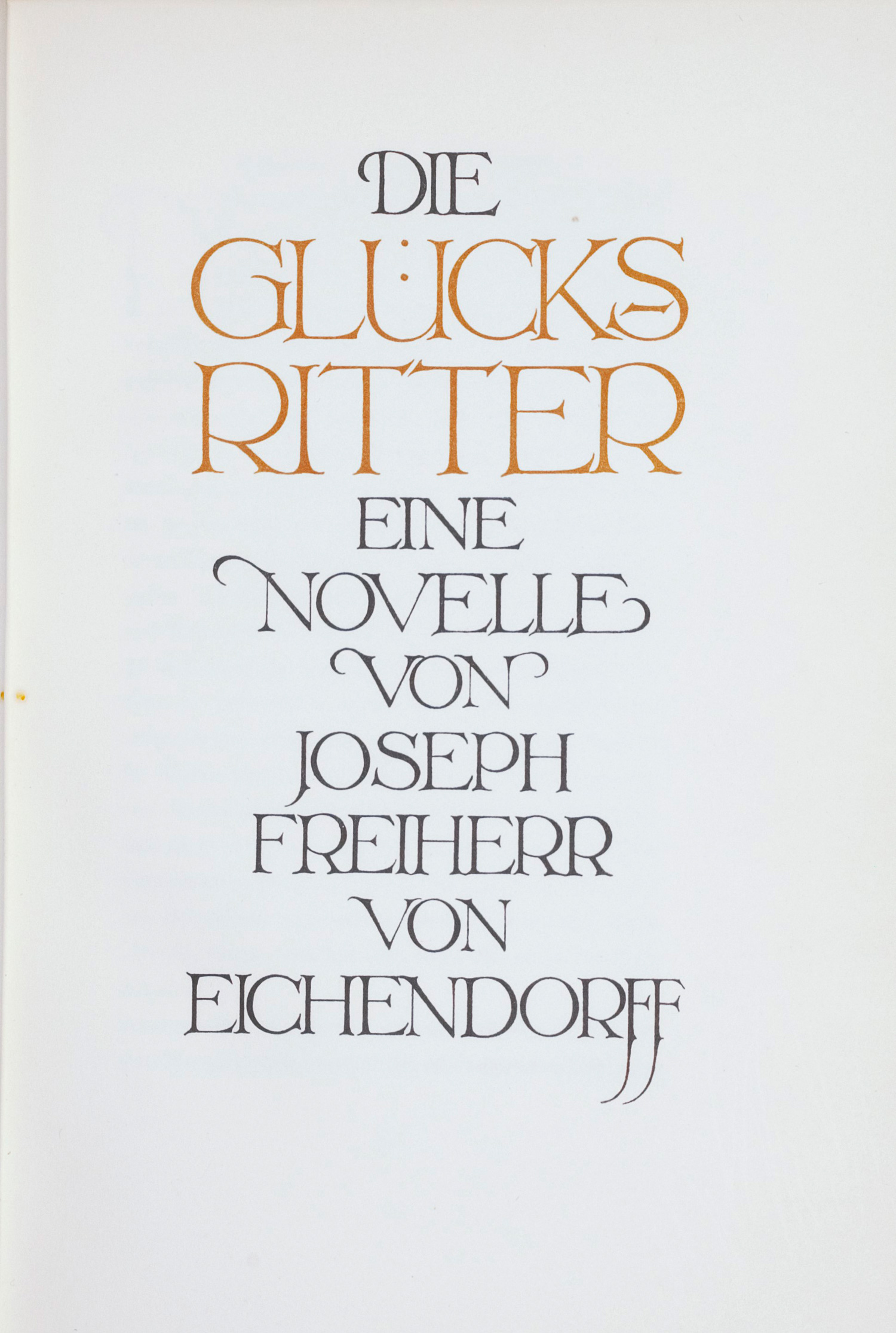 Insel-Verlag. - Eichendorff, Joseph von. Die Glücksritter. Eine Novelle. 75 S., 2 Bl. 23,5 x 15,5 cm. OPergament (schwach berieben) mit goldgeprägtem RTitel und ornamentaler Deckelvignette sowie KGoldschnitt. Leipzig, Insel, 1911.