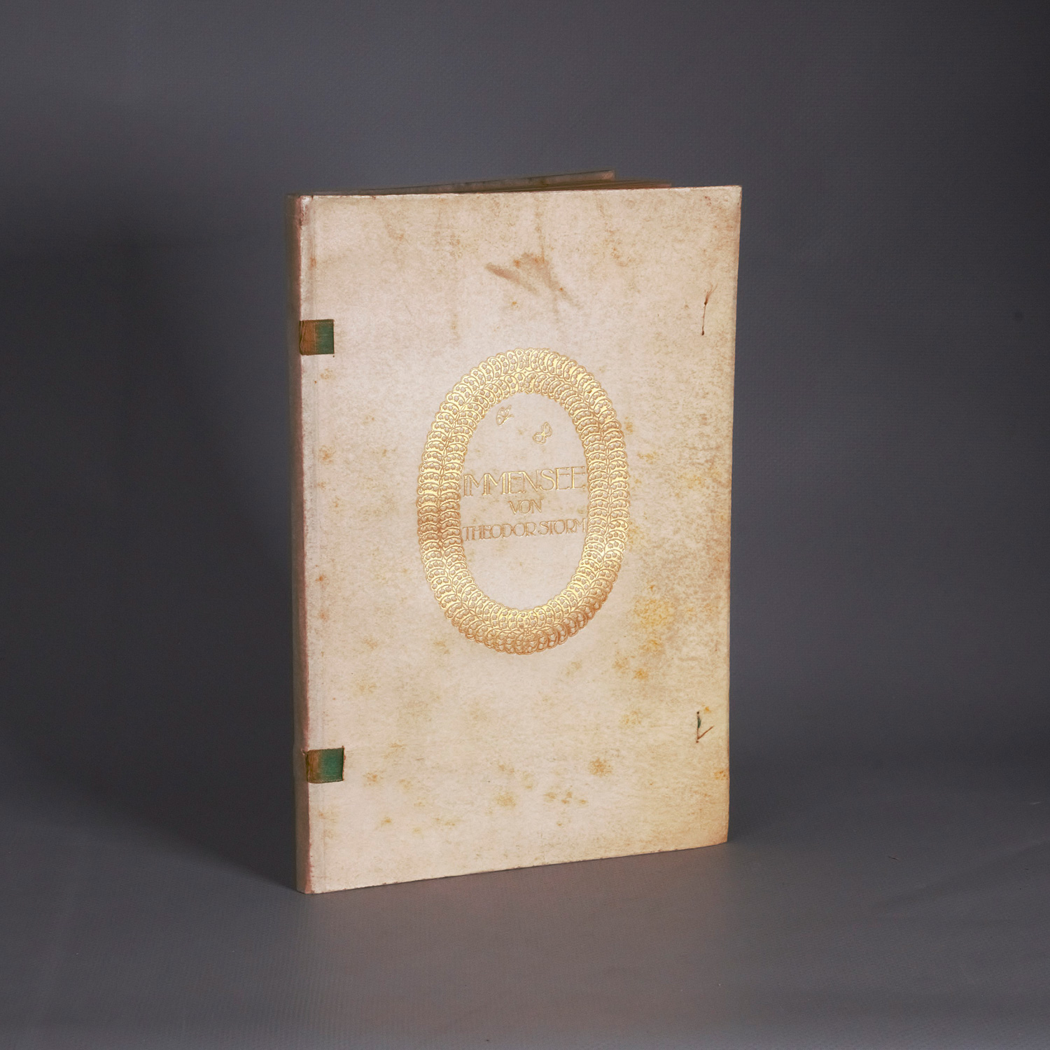 Insel-Verlag. - Storm, Theodor. Immensee. 40 S., 1 Bl. Mit 10 ornamentierten Initialen von Friedrich Wilhelm Kleukens. 22,5 x 15 cm. Flexibles OPergament (gering fleckig und berieben; ohne die Schließbänder) mit goldgeprägter Deckelvignette und KGoldschnitt. Leipzig, Insel, 1909.
