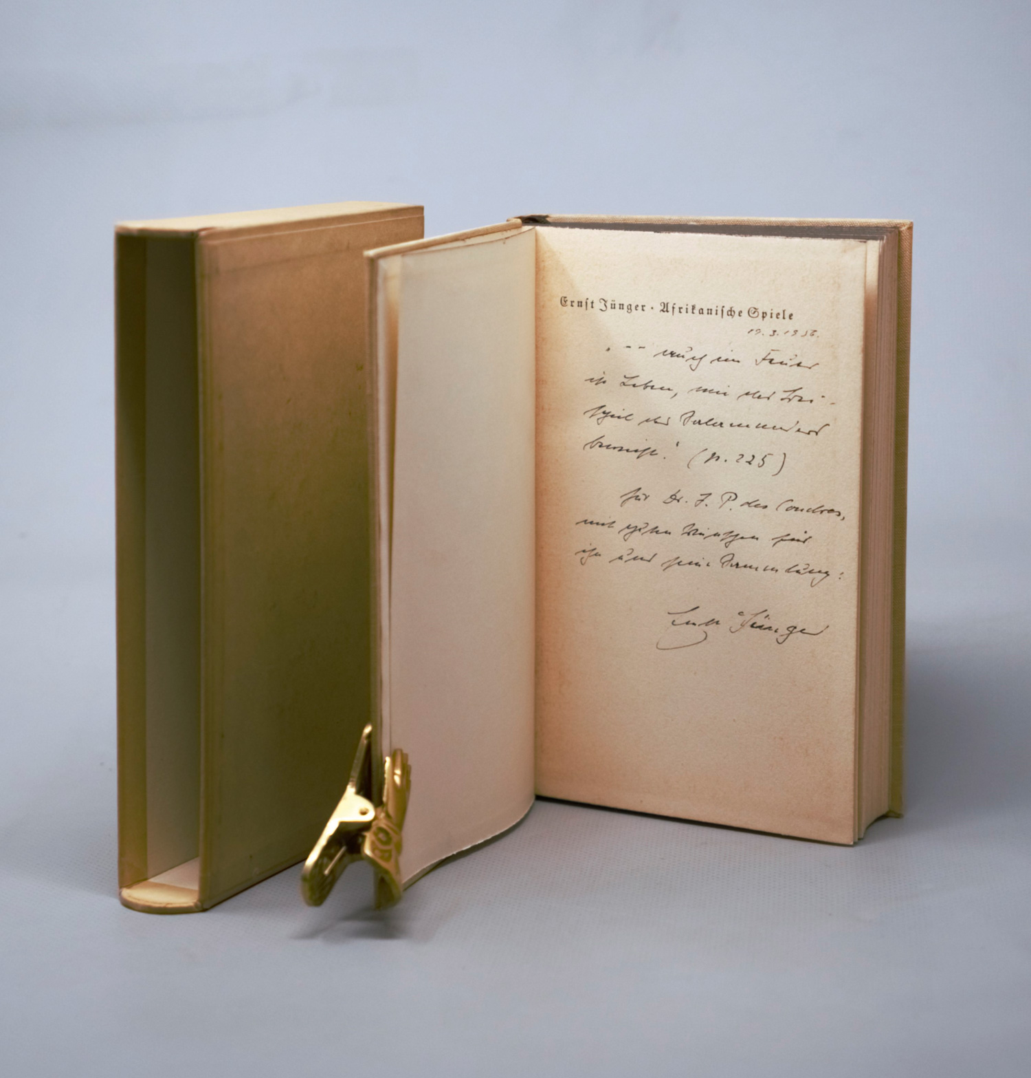 Jünger, Ernst. Afrikanische Spiele. Einmalige Ausgabe. 225 S., 3 Bl. 19 x 12 cm. Illustr. Leinenband in priv. Pappschuber (mit goldgepr. Signet "JPdC". Hamburg, Deutsche Hausbücherei, (1937).