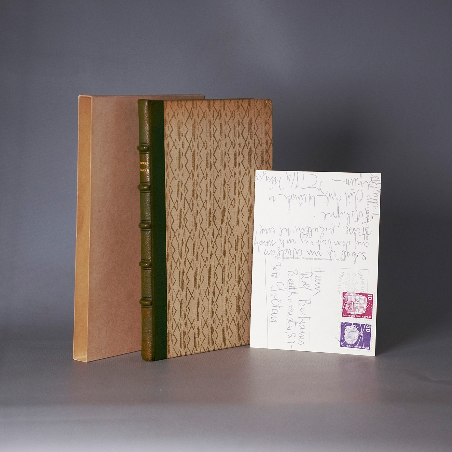 51. Publikation der Vereinigung Oltner Bücherfreunde. Des Coudres B 22. – Erste Ausgabe. Eines von 100 nummerierten Exemplaren (Gesamtauflage: 628 Ex.), auf Zerkall-Bütten. Handeinband von Hugo Peller, Solothurn. Vortitel von Ernst Jünger signiert. – Sehr gutes Exemplar. – Beiliegend eine eigenhändige Karte von Jüngers Frau Lieselotte (1978).