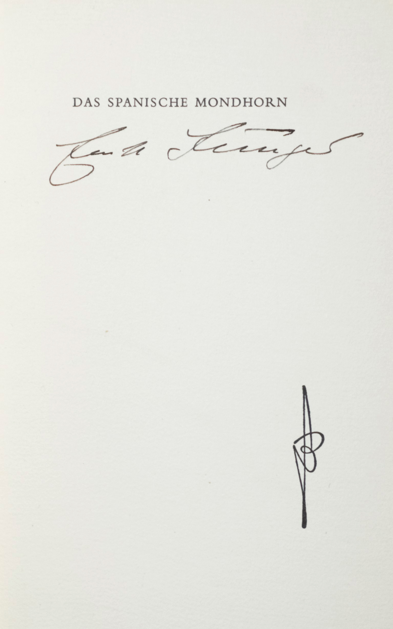 Jünger, Ernst. Das spanische Mondhorn. 55 S., 2 Bl. (1 w.). Mit einer Illustration ("Skarabäus mit Kugel") von Niklaus Stöcklin. 20 x 12 cm. Handgebundener gelber OHalbmaroquinband mit RVergoldung und KGoldschnitt. Im OPappschuber. Olten, Oltner Bücherfreunde, 1962.