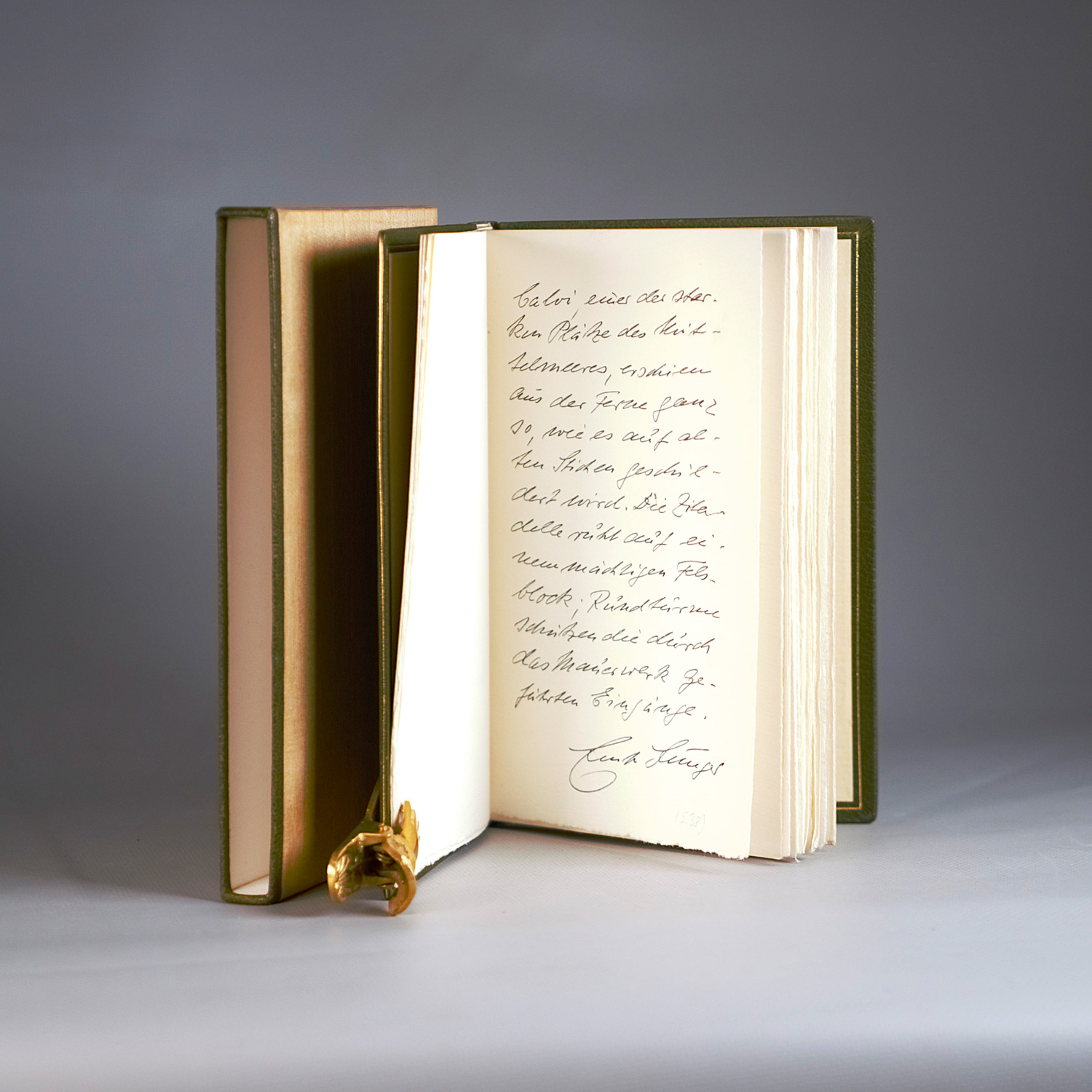 Zwölfter Oltner Liebhaberdruck. Des Coudres B 58. – Erste Ausgabe. Eines von 55 Exemplaren der Vorzugsausgabe in Ganzleder mit einem vom Autor handgeschriebenen, blattfüllenden Text auf einem Vorblatt (Gesamtauflage 630). – Sehr schönes Exemplar.