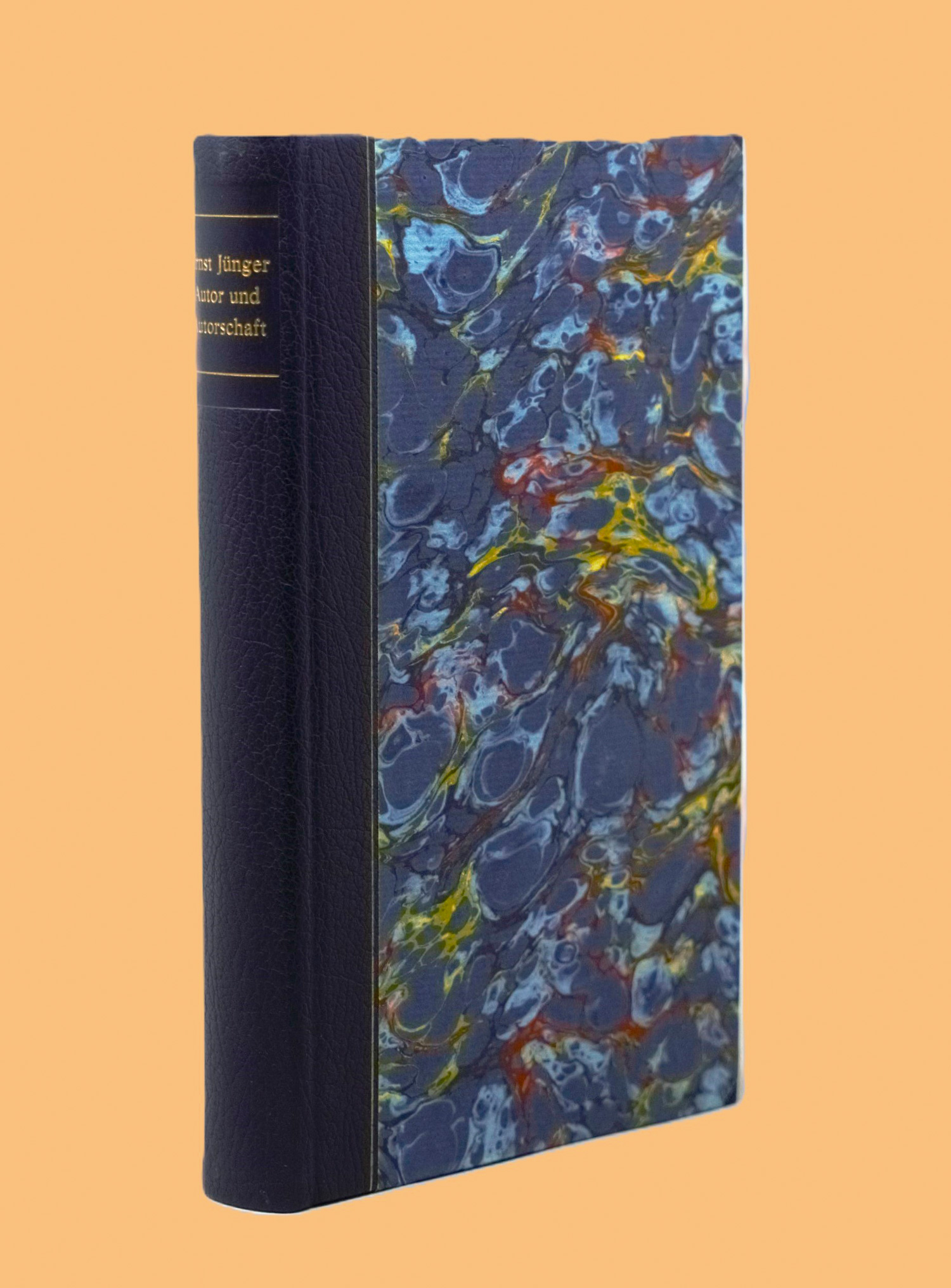 Jünger, Ernst. Autor und Autorschaft. 277 S., 1 Bl. 21,5 x 13,5 cm. Blauer Original-Halbmaroquinband im Schuber. (Stuttgart), Klett-Cotta, (1984).