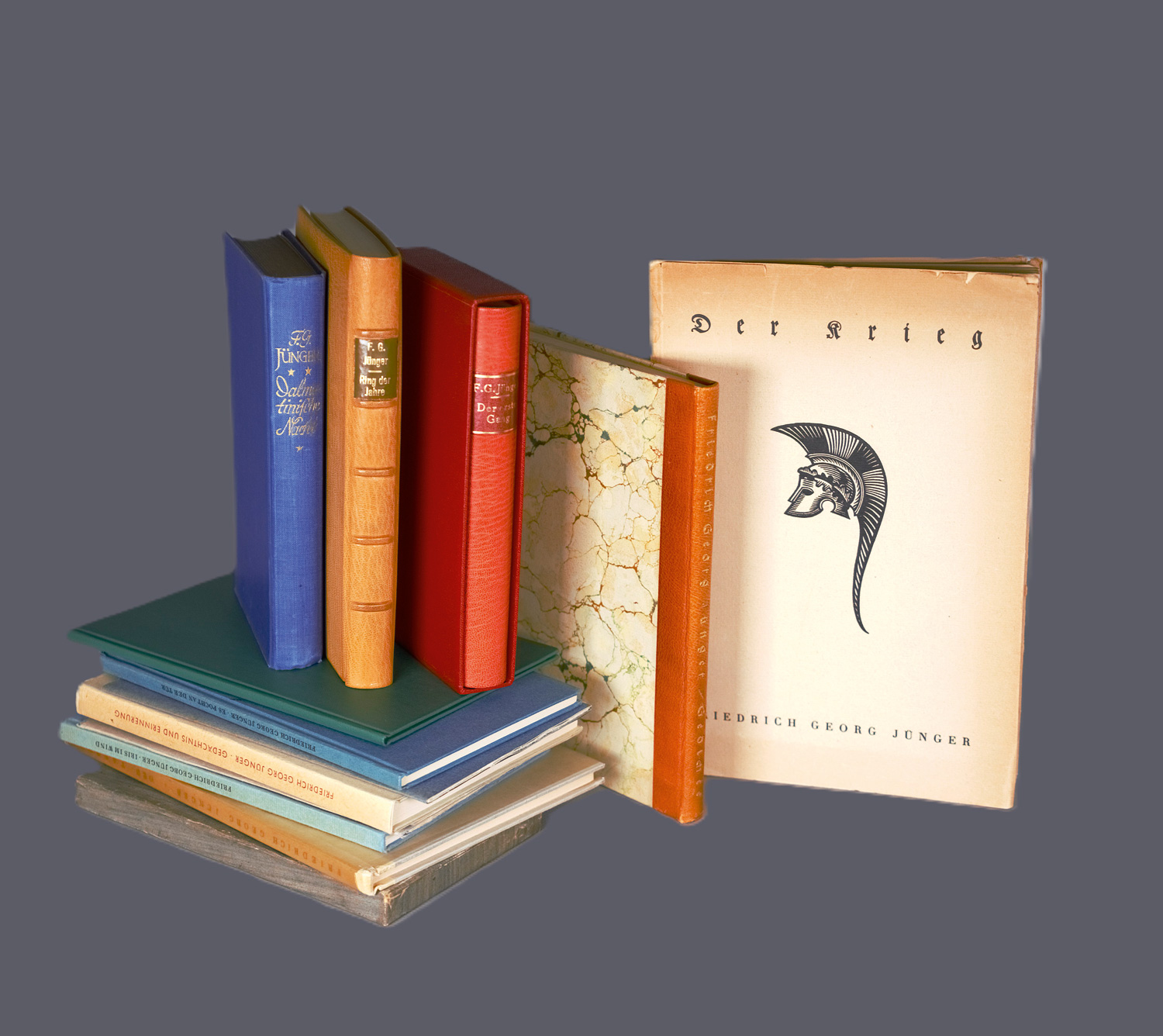Erste Ausgaben. Enthält: 1. Gedichte. Berlin, Widerstands-Verlag, 1934. - Beiliegend ein eigenhändiger Brief von Fr. G. Jünger (datiert: Überlingen, 17. Januar 1950). - 2. Der Krieg. Berlin, Widerstands-Verlag, 1936. - 3. Der Taurus. Gedichte. Hamburg, Hanseatische Verlagsanstalt, 1937. - Vom Autor signiert. - 4. Die Silberdistelklause. Gedichte. Hamburg, Dulk, (1947). - 5. Das Weinberghaus. Gedichte. Hamburg, Dulk, (1947). - 6. Dalmatinische Nacht. Erzählungen. Tübingen, Heliopolis, 1950. - Mit eigenhändiger Widmung des Verfassers. - 7. Iris im Wind. Gedichte. Frankfurt a. M., Klostermann, 1952. - Mit Widmung des Autors. - 8. Morgenländische Stadt. Frankfurt a. M., Klostermann, 1952. - Eines von 200 Exemplaren. - Beiliegend ein eigenhändiger Brief von Friedrich G. Jünger an ein "Fräulein Hasbach" (datiert: Überlingen, 16. April 1952). - 9. Gedanken und Merkzeichen. Zweite Sammlung. Frankfurt a. M., Klostermann, 1954. - Eines von 250 Exemplaren. Mit Widmung des Autors. - 10. Ring der Jahre. Gedichte - Es pocht an der Tür. Gedichte. 2 Bde in 1 Bd. Priv. Maroquinband. Frankfurt a. M., Klostermann, 1954-1968. - Beiliegend zwei eigeh. Postkarten und ein masch.schriftl. Brief von Gretha Jünger sowie drei eigenhändige Postkarten von G. Fr. Jünger, alle an Fritz Lindemann, Goslar. 11. Gedächtnis und Erinnerung. Frankfurt a. M., Klostermann, 1957. - Vorsatz mit Widmung des Autors. - 12. Dank im Gedicht. 1. September 1958. Frankfurt a. M., Klostermann, (1958). - Eines von 200 Exemplaren. Mit Widmung von F. G. Jünger. - 13. Es pocht an der Tür. Gedichte. Frankfurt a. M., Klostermann, 1968. - Mit beiliegender eigenh. Postkarte von F. G. Jünger. - 14. Der erste Gang. Roman. Späterer priv. Maroquinband mit goldgepr. RSchild. In Pappschuber. München, Hanser, 1954. - Beiliegend eine eigenhändige Postkarte des Verfassers (an Fritz Lindemann, Goslar - datiert: Sils, 6. September 1956). - Ferner: An Dr. Schranz in Siedlingshausen. Xerokopie. Leineneinband. – Alle Bände wohlerhalten.