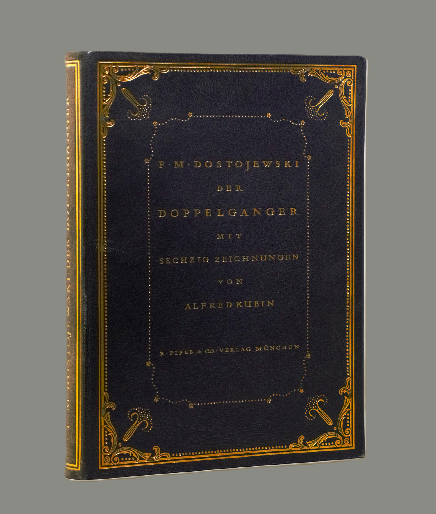 Kubin, A. - Dostojewski, Fjodor M. Der Doppelgänger. 1 Bl., 243 S., 2 Bl. Mit illustr. Titel und 60 teils ganzseitigen Illustrationen nach Federzeichnungen von Alfred Kubin. 29,5 x 21 cm. Dunkelblauer Orig.-Lederband (minimal berieben; Rücken etwas ausgeblichen) mit Rücken- und Deckelvergoldung sowie KGoldschnitt. München, Piper, (1913).