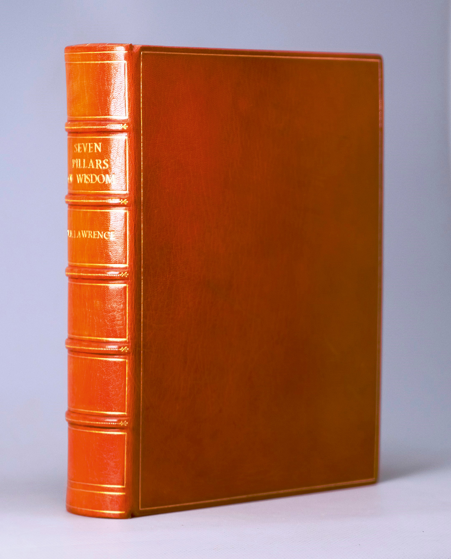Lawrence, T(homas) E(dward). Seven Pillars of Wisdom. A Triumph. 672 S. Mit zahlreichen Illustrationen auf Tafeln und 4 gefalt. Karten. 24,5 x 18,5 cm. Apricotfarbener Maroquinband d. Z. (sign.: Sangorski & Sutcliffe. London) auf 5 unechten Bünden mit Filetenvergoldung, RVergoldung und Goldschnitt. London, J. Cape, 1935.