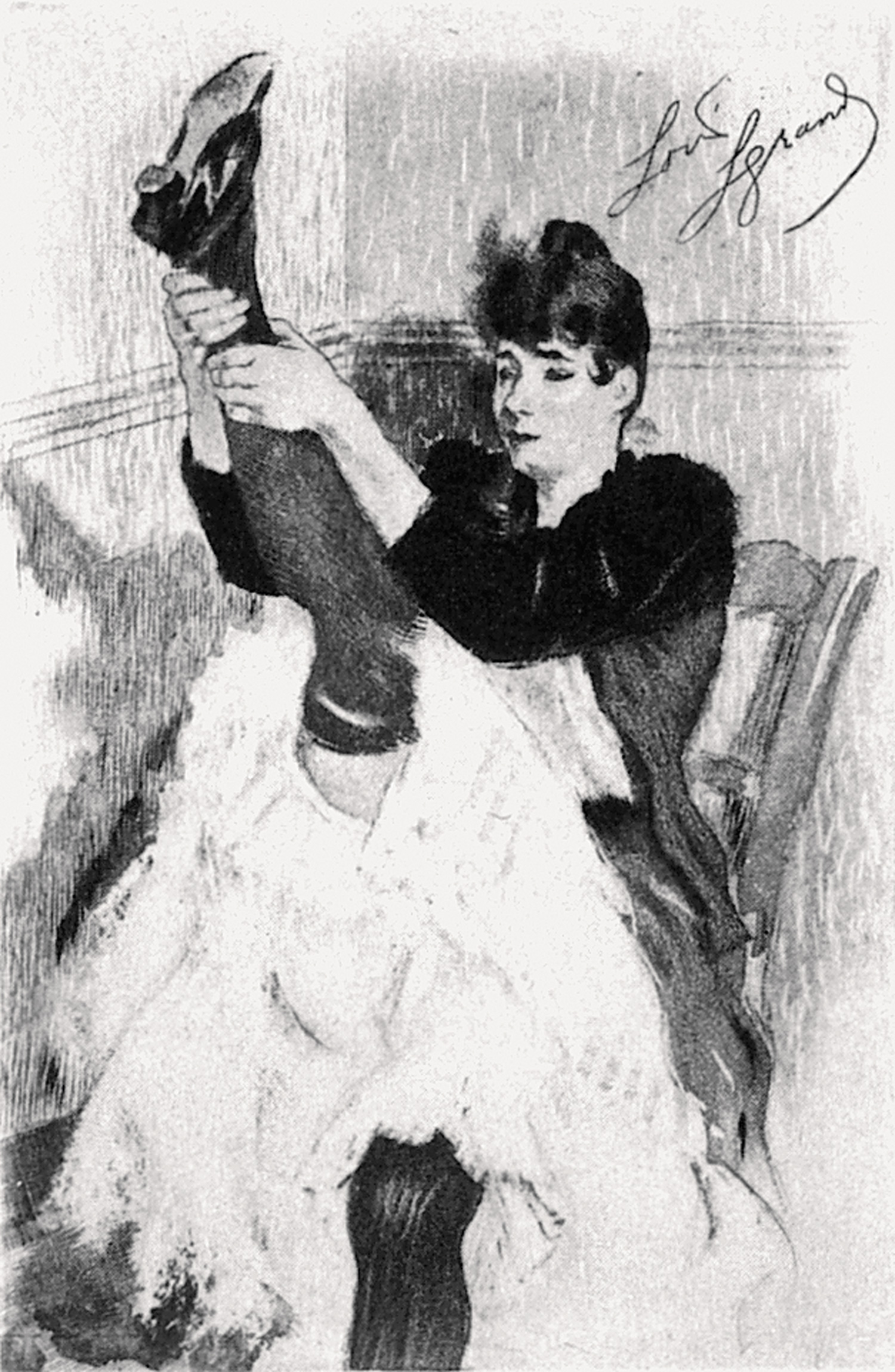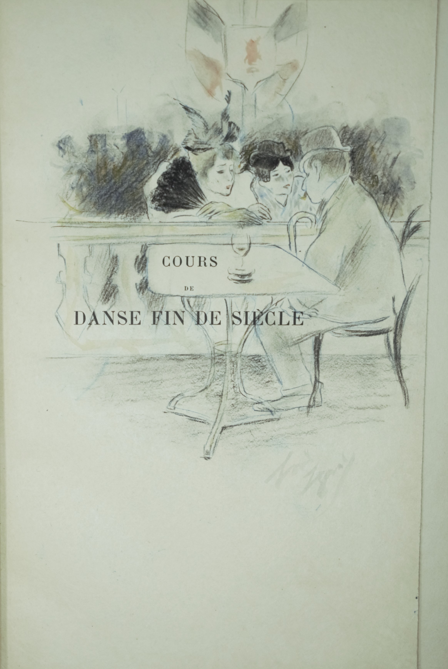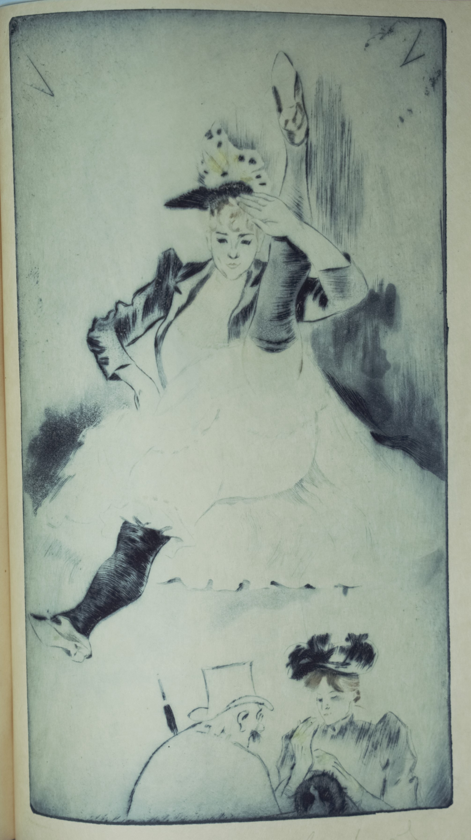 "Legrand made thirteen etchings from watercolor originals for this book. There are also a number of colored initials and vignettes in the text. The etchings are exercises in Zolaesque naturalism. No more than with Degas is there anything titillating about the dancers' poses, indeed Legrand seems to have selected their most difficult positions ...". (Ray II, S. 446f.).