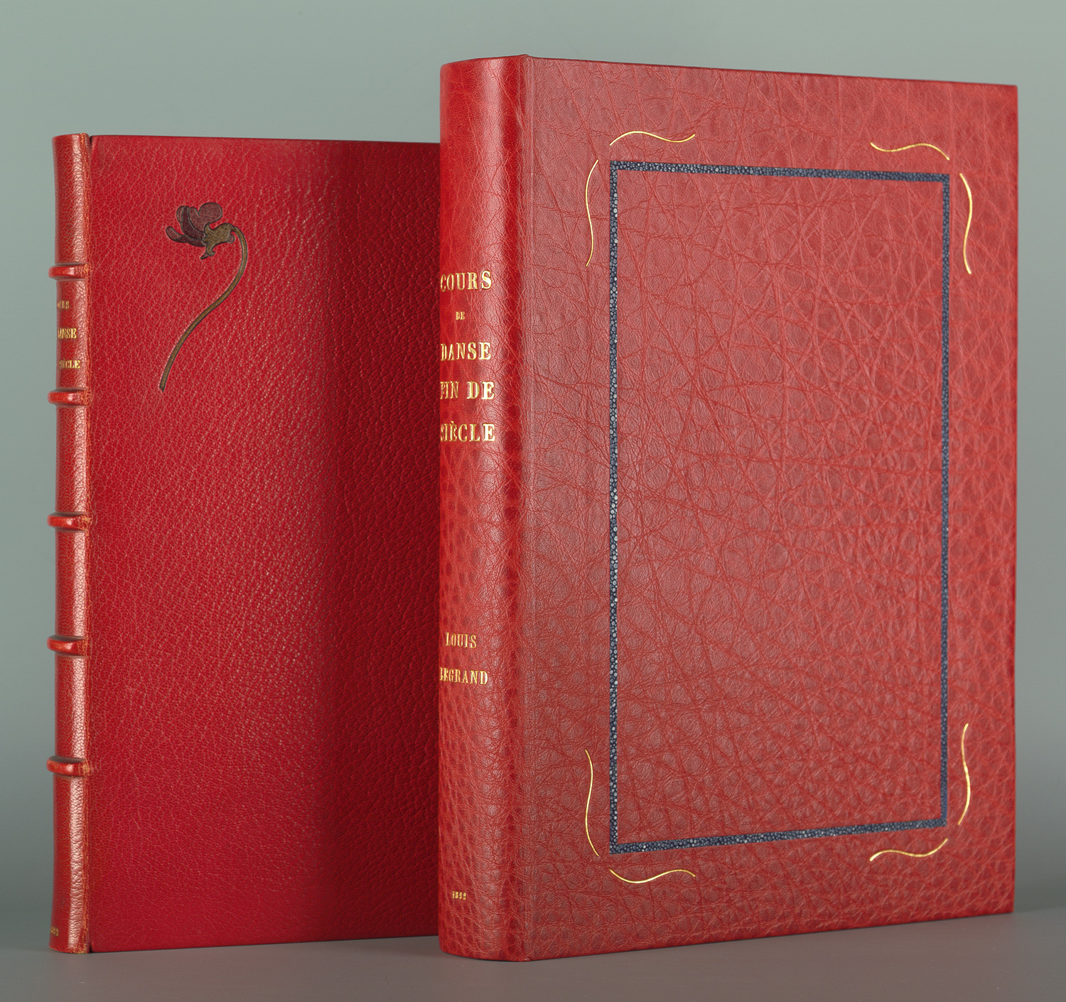 Legrand, Louis. - Cours de Danse. Fin de Siècle. 2 Bl., 56 S., 3 Bl. Titel in Rot und Schwarz. Mit 11 Original-Radierungen auf Tafeln (inkl. Frontispiz), 4 Extrasuiten sowie zahlreichen farbigen Initialen, Kopf-Vignetten und cul-de-lampes von Louis Legrand. 29 x 20,5 cm. Karmesinroter Ganzmaroquinband auf 5 Zierbünden (signiert: Canape R. D.) mit roten Seidenmoiré-Spiegeln und -Vorsätzen sowie 7facher vergoldeter Innenkantenfilete, vergoldetem RTitel und in grünem und blauem Leder intarsierter Lilie, Goldschnitt. In: Burgunderroter Leder-Kassette mit grauem Velours-Leder gefüttert, intarsierter Rochenleder-Bordüre auf den Deckeln, dezenter Vergoldung und vergoldetem RTitel. Paris, Dentu, 1892.
