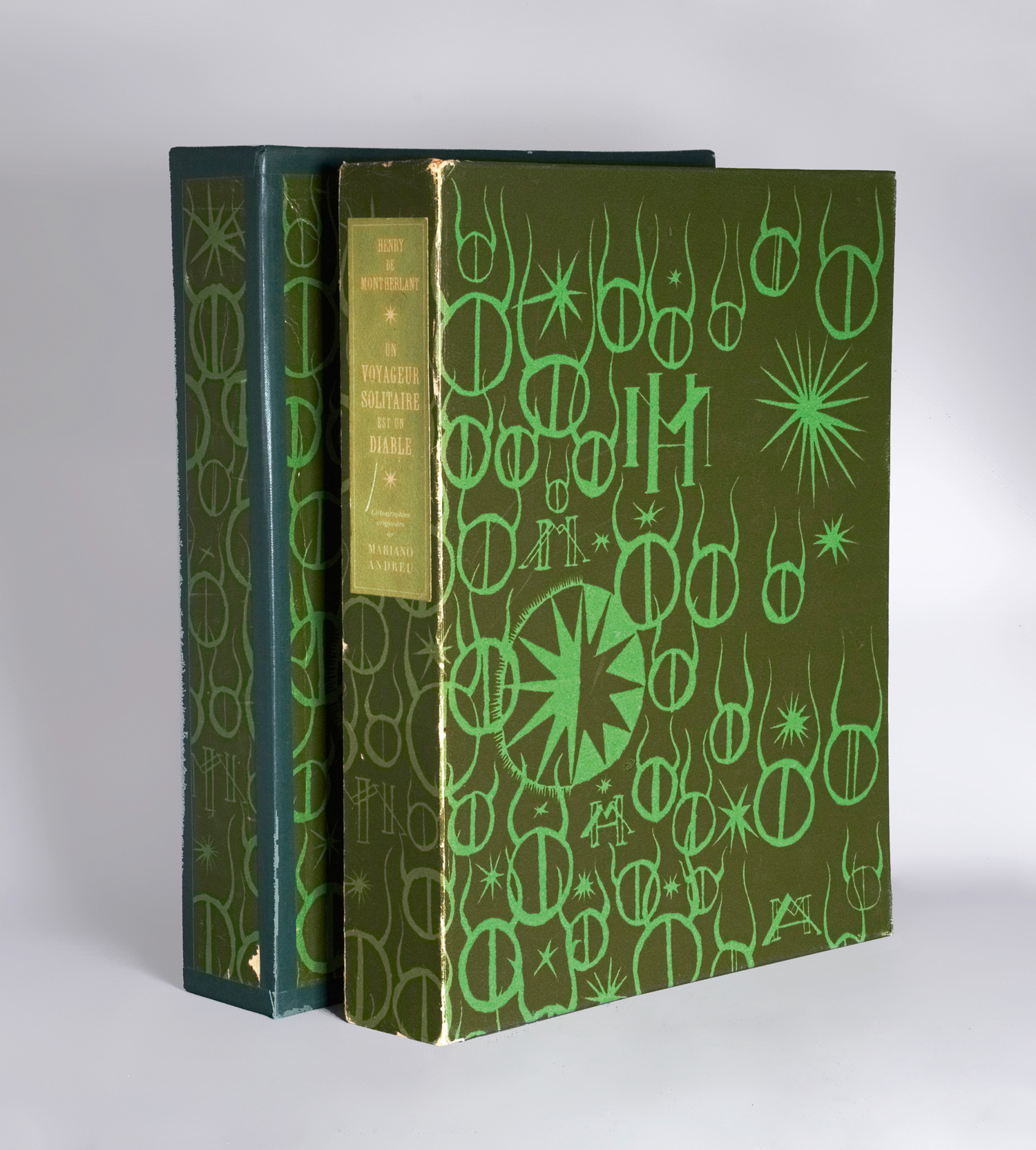 Montherlant, Henry de. Un voyageur solitaire est un diable. 216 S., 3 Bl. Mit 20 Orig.-Lithographien von Mariano Andreu. 33 x 25 cm. Lose Bögen in OUmschlag, OPappdecke und OPappschuber. Paris, H. Lefèbvre, 1945.