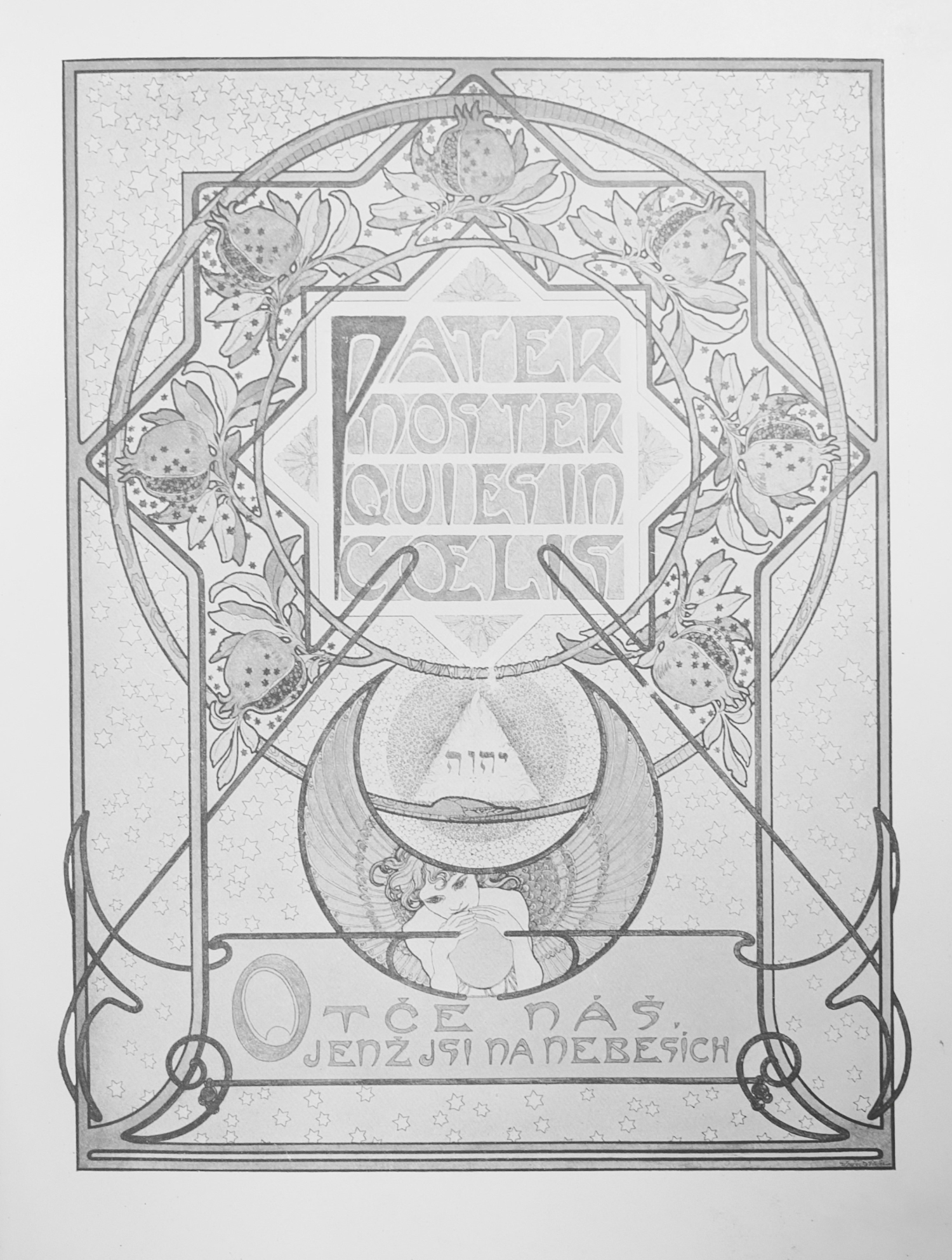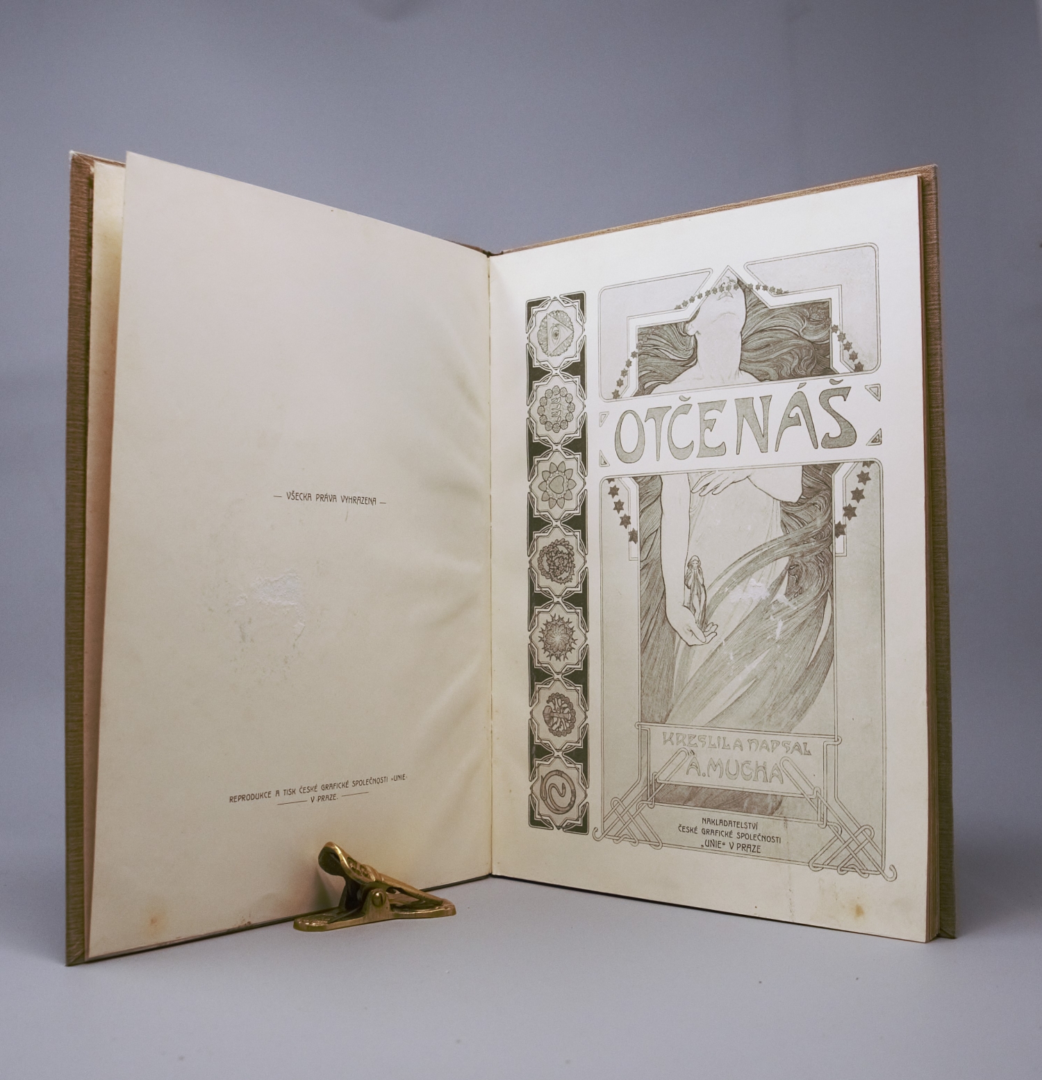 Mucha, Alfons. Otcenas. (Tschechischer Druck; deutsch: Vater Unser). 24 Bl. Mit 7 ganzs. Illustrationen sowie ornamentalem Buchschmuck von A. Mucha. 25 x 19 cm. Illustr. OLeinenband mit farb. Deckeltitel und Goldschnitt. Prag, Graphische Gesellschaft, (um 1900).