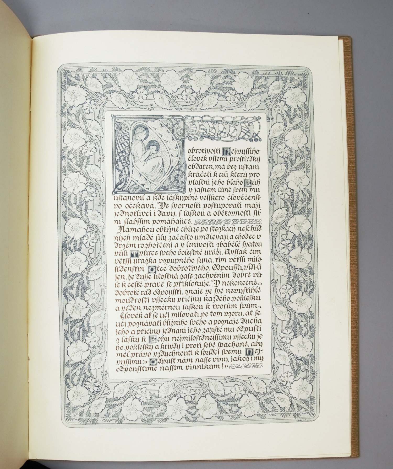 Henderson L 24a. – Frühe Jugendstilpublikation Muchas, herausgegeben von der Graphischen Gesellschaft Böhmens. Mit reich verzierten Zwischentiteln, jeweils gefolgt von einer Textseite mit Bordüre und einer Bildtafel nach Gemälden Muchas. – Vortitel und Titel sowie zwei Bl. am Schluss minimal fleckig, sonst sehr gutes, sauberes Exemplar.