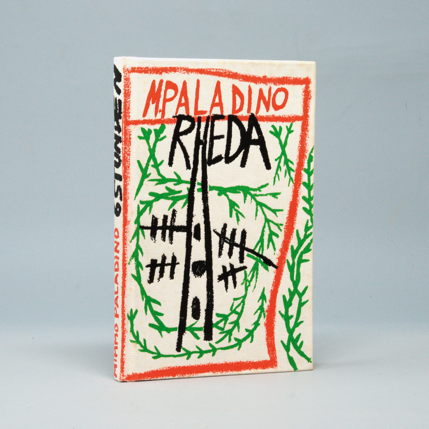 Paladino, Mimmo. Rheda 6 Stunden 6 Zeichnungen. 36 Bl. Mit 6 farbigen Zeichnungen und 2 Grundrissen. 15 x 10 cm. Farbig illustriertes OLeinen. Bielefeld, Edition Jesse, 1985.