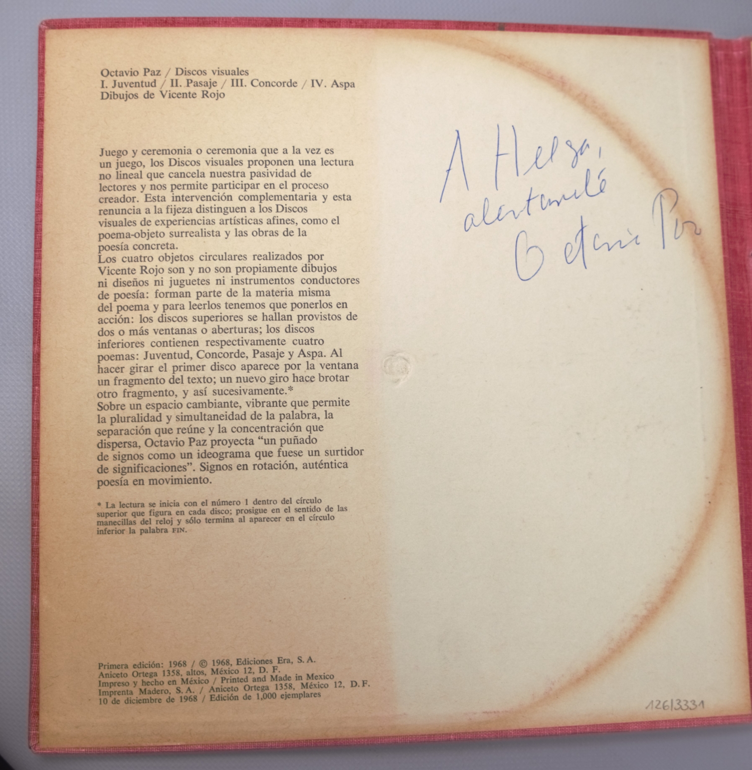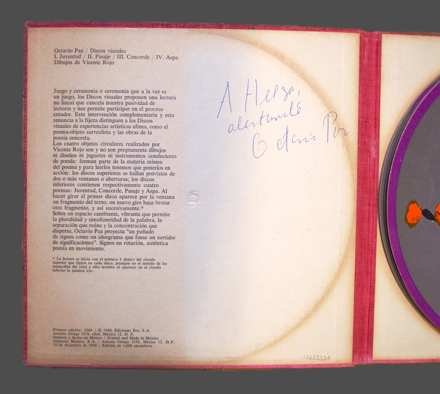 Erste Ausgabe der in kleiner Auflage erschienenen Edition. Die vier um eine Metallöse drehbaren Scheiben wurden von Vicente Rojo gestaltet. Die kombinierbaren Textzeilen, die in gegenüberliegenden ausgestanzten Feldern sichtbar werden, stammen von Octavio Paz, der 1990 den Nobelpreis für Literatur erhielt. Auf dem Innendeckel des Schubers ein Begleittext sowie eine eigenhändige Widmung des Dichters. – Gutes Exemplar.