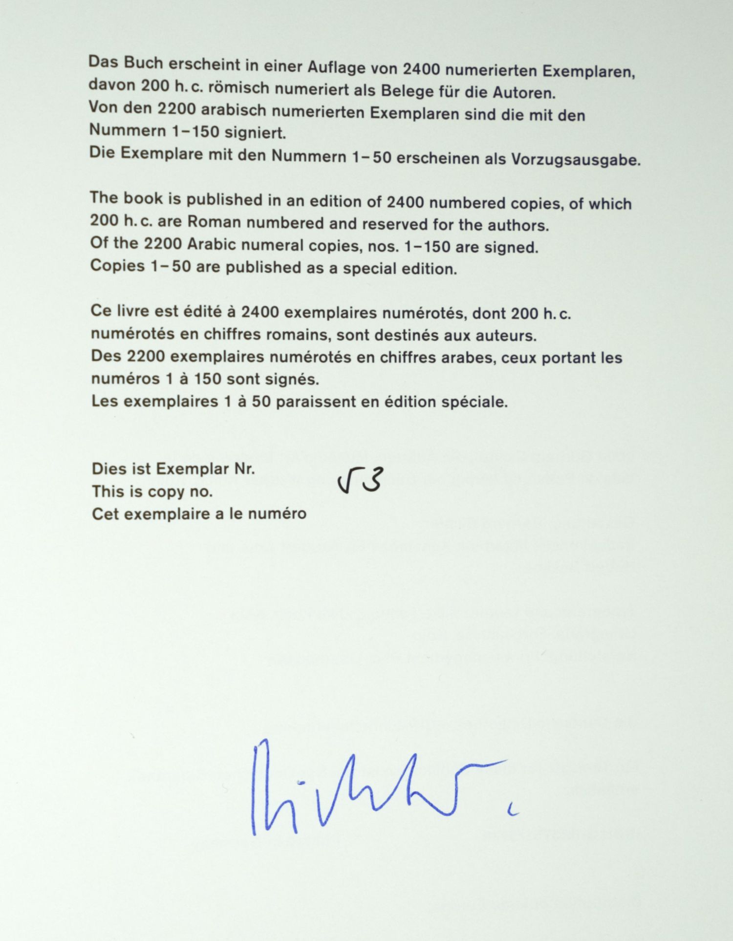 Eines von 150 nummerierten Exemplaren (Gesamtauflage: 2400 Ex.). Druckvermerk von Richter signiert. Gerhard Richter (geb. 1932) kombiniert in diesem Künstlerbuch 216 Detailaufnahmen seines Gemäldes "Abstraktes Bild Nr. 648-2" aus dem Jahr 1987 mit 216 Texten aus der Frankfurter Allgemeinen Zeitung, die am Beginn des Irak-Krieges am 20. und 21. März erschienen. – Nahezu verlagsfrisch.