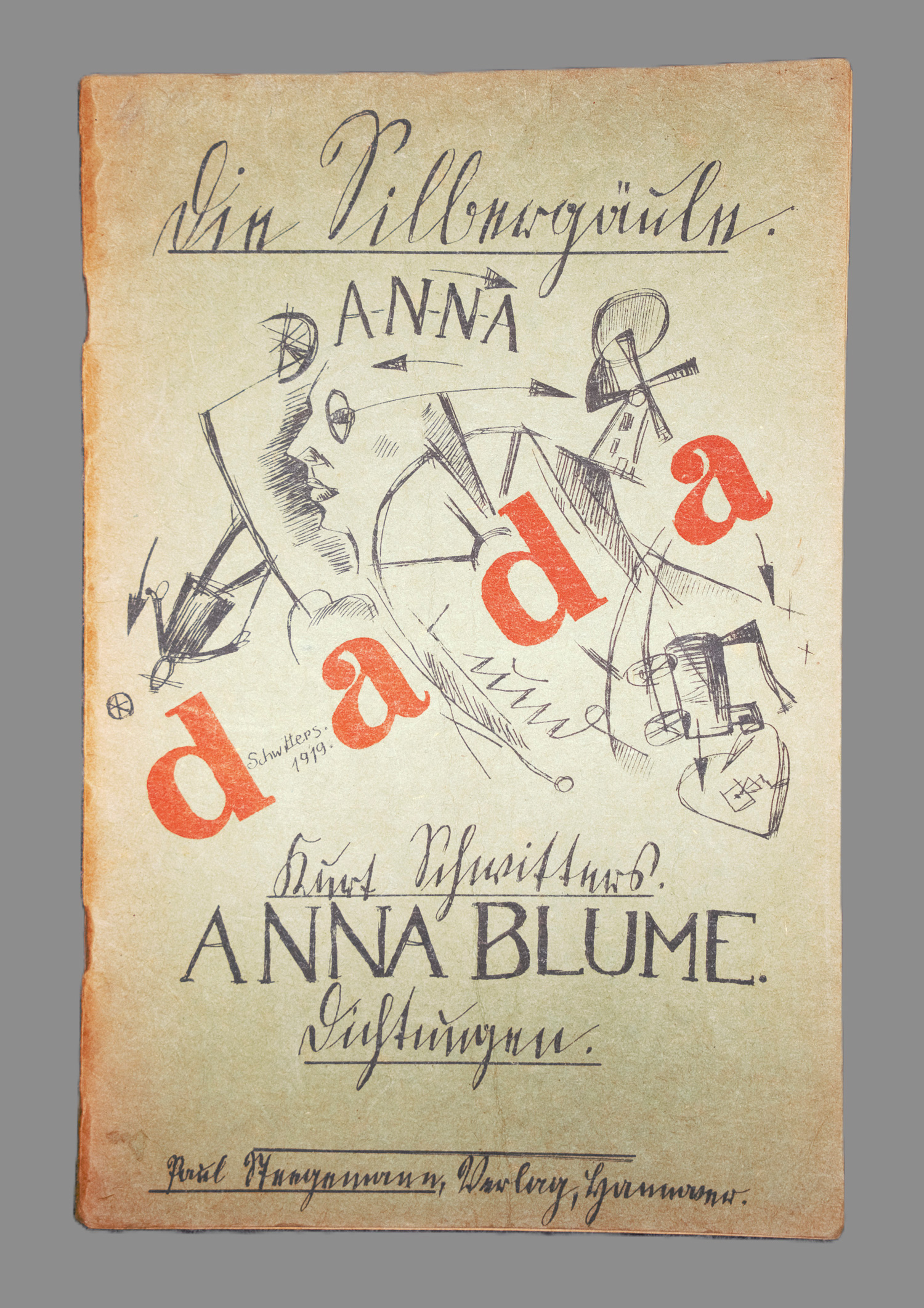 Schwitters, Kurt. Anna Blume. Dichtungen. 6.-10. Tsd. 37 S., 5 Bl. Anzeigen. 22 x 14,5 cm. Illustrierte OBroschur (Ränder stärker gebräunt). Hannover, Paul Steegemann, 1919.