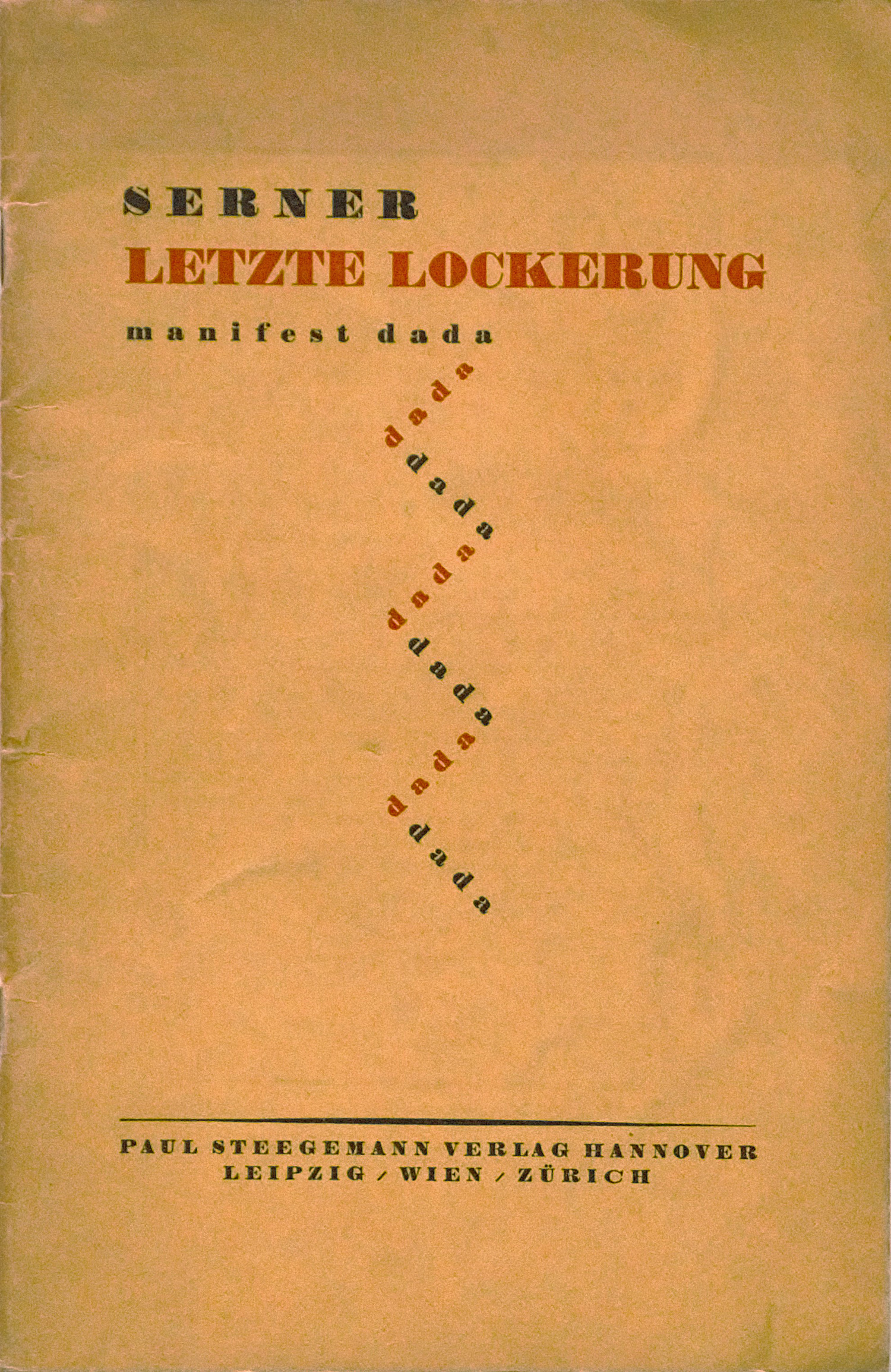 Serner, Walter. Letzte Lockerung. Manifest dada. 45 S., 1 Bl. 22 x 14,5 cm. Typographisch illustrierte OBroschur (gering berieben, lichtrandig). Hannover, Paul Steegemann, 1920.
